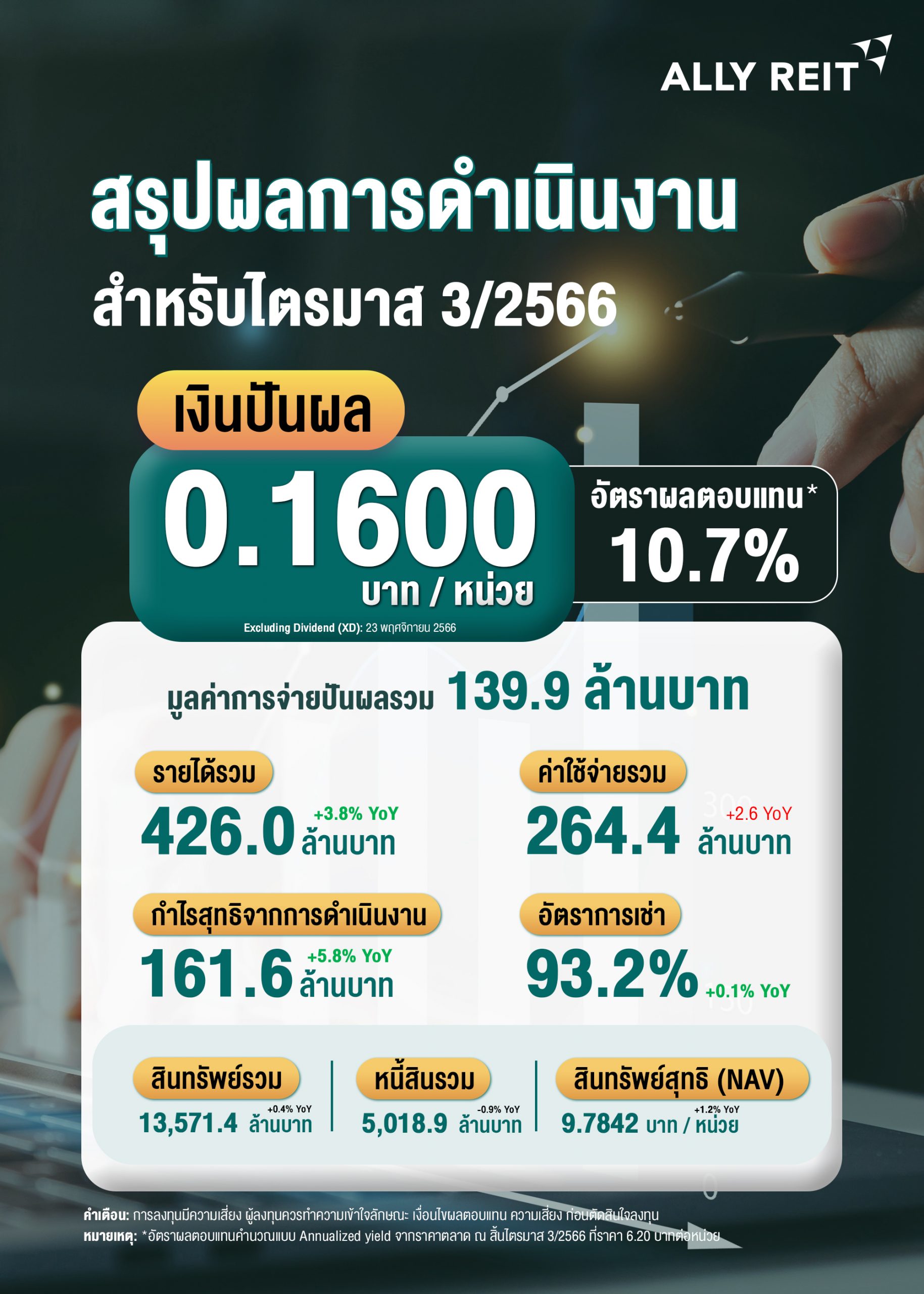 ทั้งนี้ จากผลการดำเนินงานไตรมาส 3 ปี 2566 ล่าสุด กองทรัสต์ประกาศจ่ายปันผล ในอัตรา 0.1600 บาทต่อหน่วย รวมมูลค่าการจ่ายอยู่ที่ 139.9 ล้านบาท โดยที่ผ่านมาสำหรับผลการดำเนินงานสำหรับ 9 เดือน กองทรัสต์อัลไล จ่ายปันผลไปแล้วทั้งสิ้น 0.4970 บาทต่อหน่วย รวมมูลค่าการจ่ายอยู่ที่ 434.4 ล้านบาท คิดเป็นอัตราผลตอบแทนอยู่ที่ 10.7% เมื่อเทียบกับราคาตลาด ณ สิ้นไตรมาส 3 ปี 2566
