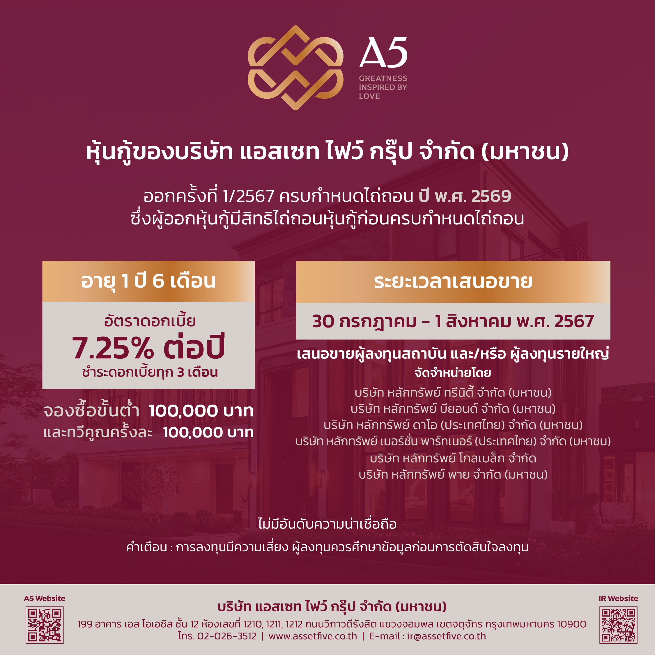 นาย ศุภโชค ปัญจทรัพย์ ประธานเจ้าหน้าที่บริหาร บริษัท แอสเซท ไฟว์ กรุ๊ป จำกัด (มหาชน) หรือ A5 กล่าวเสริมว่า บริษัทมีจุดแข็งด้านความเชี่ยวชาญการพัฒนาโครงการที่อยู่อาศัย โดยเน้นพัฒนาโครงการประเภทแนวราบลักชัวรีเป็นหลัก ซึ่งได้รับการตอบรับที่ดีจากกลุ่มลูกค้าเรียลดีมานด์มาโดยตลอด จึงเดินหน้าพัฒนาโครงการอย่างต่อเนื่อง มุ่งเน้นพัฒนาที่อยู่อาศัยบนทำเลศักยภาพ โซนกรุงเทพฯ ตะวันออก-ตก ด้วยจุดเด่นดีไซน์ที่แตกต่าง พื้นที่ใช้สอยคุ้มค่า วัสดุก่อสร้าง-ตกแต่งที่มีมาตรฐาน รวมถึงบรรยากาศภายนอกที่เป็นส่วนหนึ่งของธรรมชาติ สร้างสุนทรียภาพของการอยู่อาศัย ตอบโจทย์กลุ่ม Niche Market ที่มีไลฟ์สไตล์และความสนใจชัดเจน ซึ่งถือเป็นกลุ่มเป้าหมายที่บริษัทมีความเชี่ยวชาญ ผ่านการวิจัยศึกษาตลาดและพฤติกรรมกลุ่มเป้าหมาย อีกทั้งยังคงมองหาโอกาสขยายโครงการไปในทำเลที่มีศักยภาพสูง เพื่อพัฒนาโครงการใหม่เพิ่มเติมในอนาคต เพื่อสร้างโอกาสทางการขายผลักดันให้ยอดขายเป็นไปตามเป้าหมายที่วางไว้ “มั่นใจว่าการออกเสนอขาย หุ้นกู้ AFIVE ครั้งที่ 1/2567 จะได้รับการตอบรับที่ดีจากนักลงทุน สำหรับวัตถุประสงค์การออกและเสนอขายหุ้นกู้ครั้งนี้เพื่อนำไปชำระคืนหุ้นกู้ชุดเดิมที่กำลังจะครบกำหนด และเป็นเงินทุนหมุนเวียนของบริษัท ช่วยเสริมสภาพคล่องทางการเงิน รองรับการขยายโครงการใหม่ สร้างการเติบโตอย่างต่อเนื่อง” นายศุภโชค กล่าว