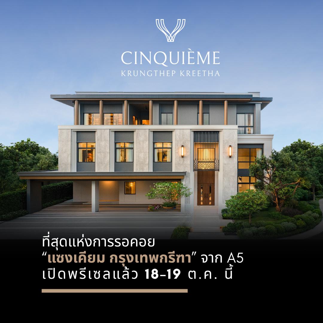 บริษัท แอสเซท ไฟว์ กรุ๊ป จำกัด (มหาชน) หรือ A5 เตรียมเปิดพรีเซล โครงการใหม่ “Cinquième Krungthep Kreetha” (แซงเคียม กรุงเทพกรีฑา) บ้าน Private Pool Villa หรูระดับ Ultra Luxury จำนวนจำกัดเพียง 16 ยูนิต ภายใต้แนวคิด “The Fifth Dimension of Privacy Living” ที่เน้นความเป็นส่วนตัวและคุณภาพชีวิตในทุกมิติ