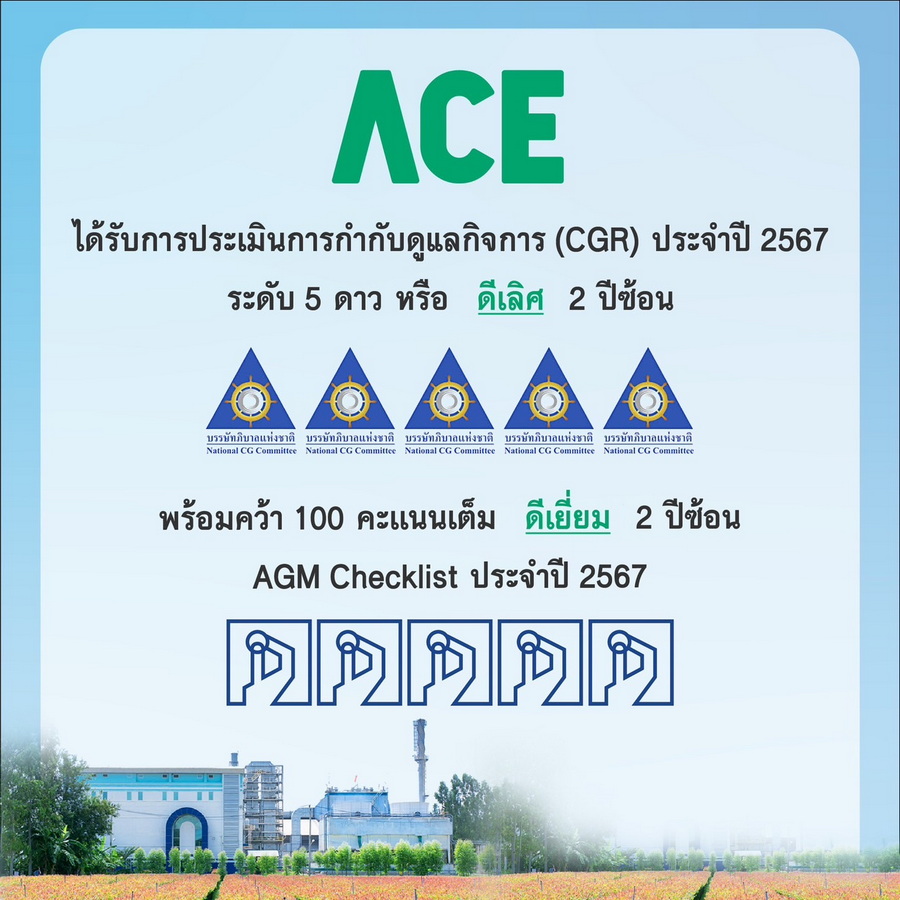 ACE ยิ้มร่ารับข่าวดี หลังได้รับการประเมิน CGR ประจำปี 2567 ในระดับ “ดีเลิศ (Excellent)” หรือ 5 ดาว ต่อเนื่องเป็นปีที่ 2 และเพิ่งคว้า AGM Checklist ระดับดีเยี่ยม 100 คะแนนเต็ม การันตีมาตรฐานกำกับกิจการที่ดี-พัฒนาอย่างยั่งยืน ย้ำภาพผู้นำโรงไฟฟ้าพลังงานสะอาดตัวจริง