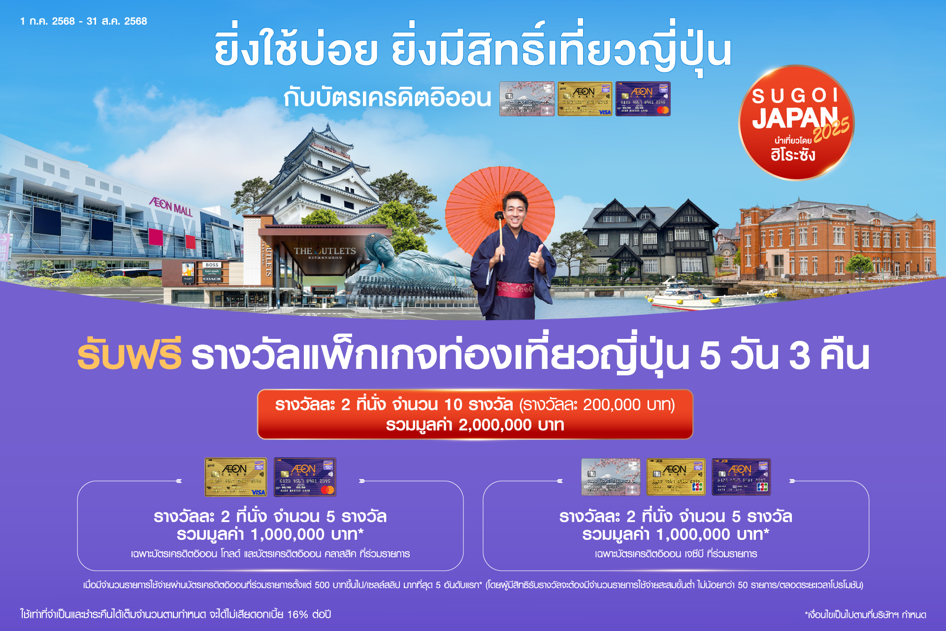 บริษัท อิออน ธนสินทรัพย์ (ไทยแลนด์) จำกัด (มหาชน) ตอกย้ำความเป็นตัวจริงเรื่องเที่ยวญี่ปุ่น พร้อมเปิดตัวแคมเปญ “SUGOI JAPAN 2025 by AEON” ที่ปีนี้พร้อมพาลูกค้าคนพิเศษของอิออนไปสัมผัสมนต์เสน่ห์แดนใต้ของญี่ปุ่น ณ เกาะคิวชู จัดเต็มทั้งบัตรโดยสารการบินไทยและที่พัก พร้อมตะลุยกิน เที่ยว ชอป แบบสุโก้ย แพกเก็จมูลค่ารวมกว่าสองล้านบาท สิทธิพิเศษๆ แบบนี้ สำหรับ 10 ท่าน ที่มีจำนวนยอดใช้จ่ายมากที่สุดผ่านบัตรเครดิตอิออนที่ร่วมรายการ ณ ร้านค้าทั่วโลก ตามเงื่อนไขที่กำหนด ตั้งแต่วันนี้ ถึงวันที่ 31 สิงหาคม 2568