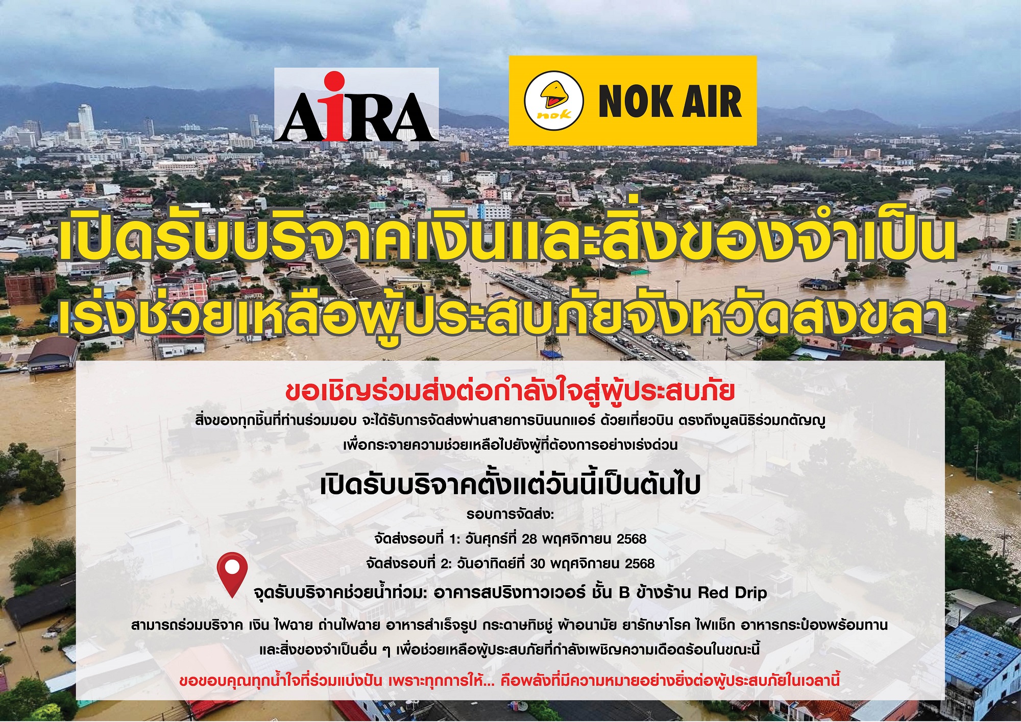 บริษัท ไอร่า แคปปิตอล จำกัด (มหาชน) หรือ AIRA ร่วมกับ สายการบินนกแอร์ เคียงข้างสังคมไทย พร้อมร่วมเป็นอีกแรงช่วยเหลือพี่น้องประชาชนที่ได้รับผลกระทบจากอุทกภัยน้ำท่วม เดินหน้าเปิดจุดรับบริจาคเงินและสิ่งของจำเป็น เร่งช่วยเหลือผู้ประสบภัยจังหวัดสงขลา อาทิ เงิน,ไฟฉาย, ถ่านไฟฉาย, อาหารสำเร็จรูป, กระดาษทิชชู, ผ้าอนามัย, ยารักษาโรค, ไฟแช็ก, อาหารกระป๋องพร้อมทาน และสิ่งของจำเป็นอื่น ๆ โดยสิ่งของบริจาคจะขนส่งผ่านเที่ยวบินของสายการบินนกแอร์ เพื่อส่งต่อความช่วยเหลือสู่ผู้ประสบภัยในพื้นที่อย่างเร่งด่วน