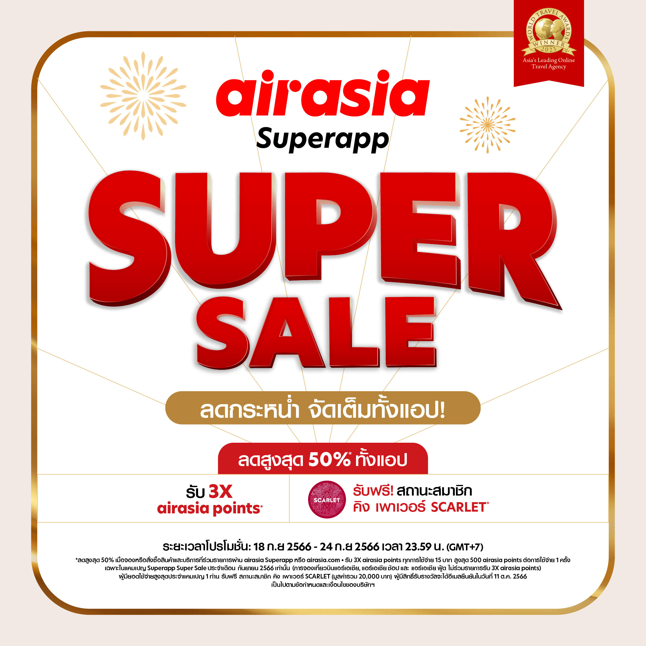 airasia Superapp สานต่อความสำเร็จของโปรสุดคุ้มประจำเดือนที่ขาเที่ยวรอคอย “Superapp Super Sale” ด้วยโปรใหญ่ลดคุ้มสะใจ ลดสูงสุด 50%* ผู้ที่มียอดช้อปสูงสุดลุ้นรับฟรี! สถานะสมาชิก คิง เพาเวอร์ SCARLET พร้อมรับเงิน E-Purse มูลค่า 20,000 บาท* เข้าบัญชีสมาชิกฯ