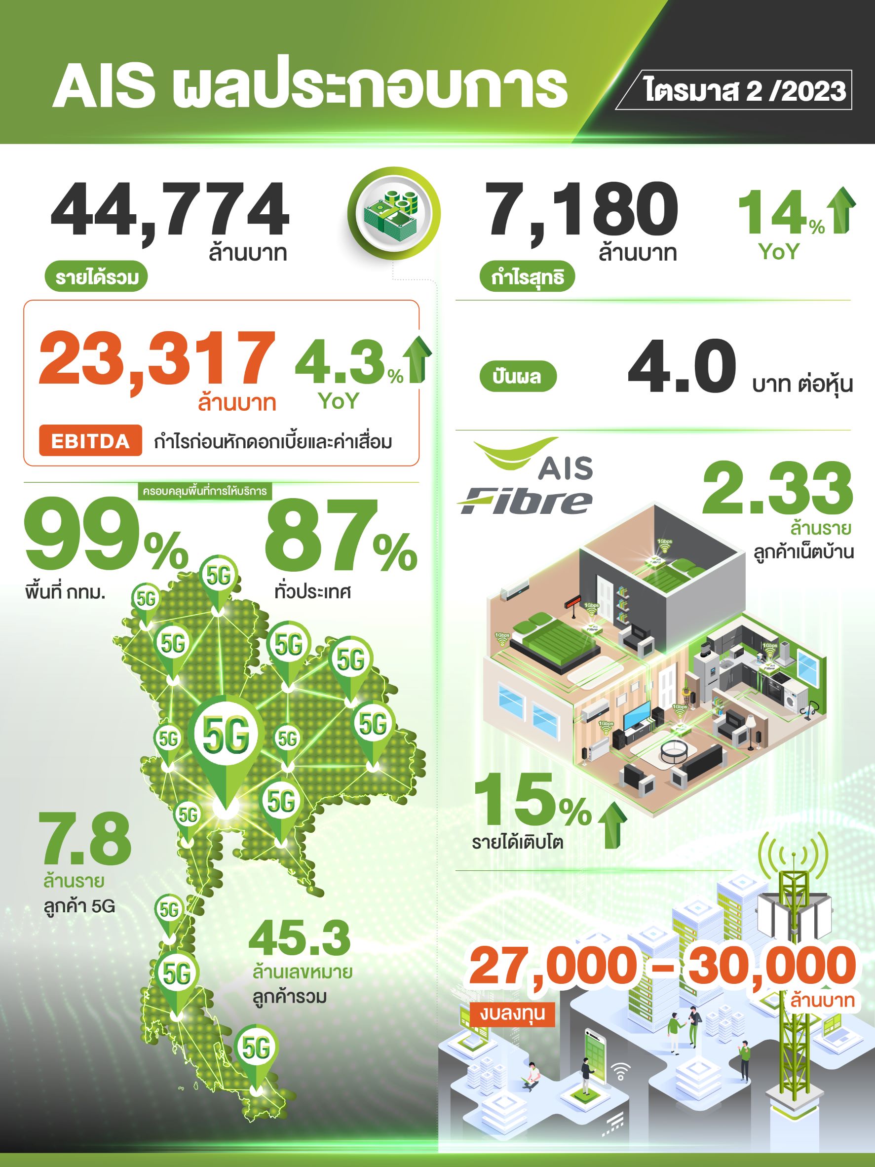 AIS เผยผลประกอบการประจำไตรมาส 2 ประจำปี 2566 ทำรายได้รวมอยู่ที่ 44,774 ล้านบาท ลดลง 1.1% เมื่อเทียบกับช่วงเดียวกันของปีก่อน และลดลง 4.1% จากไตรมาสก่อน จากปัจจัยตามฤดูกาลของการขายโทรศัพท์เคลื่อนที่ พร้อมทั้งส่งมอบกำไรสุทธิได้อย่างแข็งแกร่งที่ 7,180 ล้านบาท เติบโต 14% เมื่อเทียบกับไตรมาส 2 ปีก่อน เป็นผลมาจากการการเติบโตของรายได้จากการให้บริการหลักควบคู่ไปกับการบริหารต้นทุนจากการดำเนินงานได้อย่างมีประสิทธิภาพ และการมุ่งเน้นคุณภาพของการให้บริการทุกมิติ โดยในครึ่งปีหลัง AIS ยังคงเดินหน้าลงทุนเพื่อยกระดับคุณภาพบริการและโครงข่ายอัจฉริยะ 5G เพื่อรองรับการเติบโตของตลาดผู้ใช้งาน เสริมขีดความสามารถของกลุ่มธุรกิจหลัก พร้อมทั้งเดินหน้าขยายโครงข่ายอินเทอร์เน็ตบ้านความเร็วสูงในพื้นที่ใหม่ๆ การพัฒนาโครงข่ายและโซลูชันสำหรับภาคธุรกิจ ด้วยงบประมาณ 27,000-30,000 ล้านบาท พร้อมขับเคลื่อนองค์กรสู่การเป็นผู้ให้บริการเทคโนโลยีอัจฉริยะ หรือ Cognitive Tech-Co ตามแผน