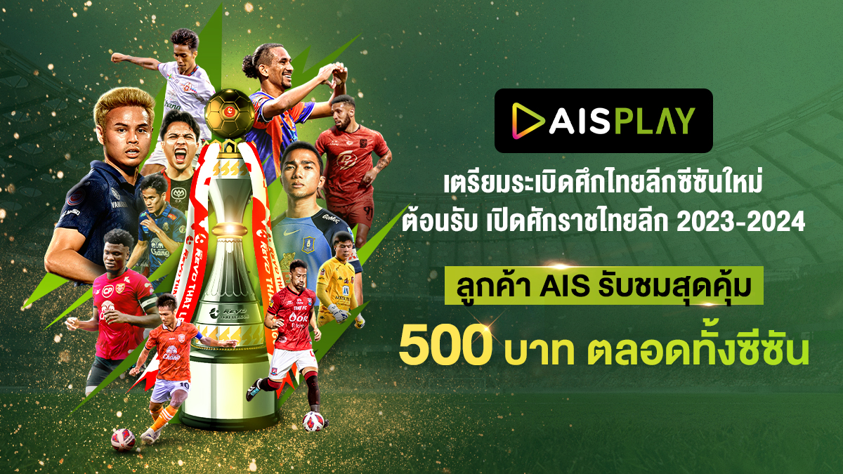 AIS PLAY เดินหน้าทำงานร่วมกับสมาคมฟุตบอลแห่งประเทศไทยฯ และ บริษัท ไทยลีก จำกัด อย่างต่อเนื่อง เป็นปีที่ 3 พร้อมส่งตรงการแข่งขัน ไทยลีก เอฟเอคัพ และลีกคัพ ให้แฟนบอลได้รับชมและติดขอบจอกันแบบเชียร์แบบจุใจทั้งการชมสด ดูพร้อมไฮไลท์ และ รีรัน ได้อย่างจุใจ ผ่านทุกช่องทางบน AIS PLAY พิเศษสำหรับลูกค้า AIS รับชมสุดคุ้มเพียง 500 บาท ตลอดทั้งฤดูกาล 2023-2024 เพียงกด *677*1# โทรออก