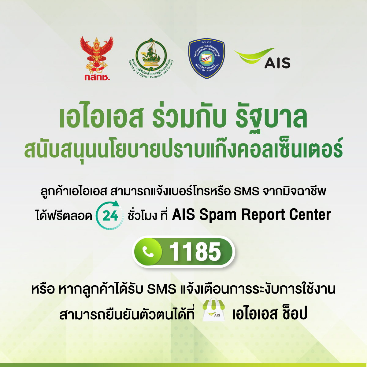 “และจากกรณีล่าสุด AIS พร้อมยกระดับการทำงานไปอีกขั้น โดยร่วมกับ ภาครัฐ นำโดย กระทรวงดิจิทัลเพื่อเศรษฐกิจและสังคม (ดีอีเอส) สำนักงานตำรวจแห่งชาติ และสำนักงาน กสทช.ในการกวาดล้างแก๊งคอลเซ็นเตอร์ โดยมุ่งไปที่เบอร์โทร ซึ่งเป็นเลขหมายแบบเติมเงินเท่านั้น (ไม่รวมถึงเลขหมายแบบรายเดือน หรือเบอร์ที่ลงทะเบียนภายใต้หน่วยงานหรือองค์กร) ที่มีการโทรออกเป็นจำนวนมากแบบผิดปกติ และหลังจากตรวจสอบร่วมกับหน่วยงาน AOC ของภาครัฐ แล้ว AIS จะส่ง SMS แจ้งเตือนและระงับการใช้งานหมายเลขดังกล่าวทันที อย่างไรก็ตาม เพื่อเป็นการปกป้องสิทธิเสรีภาพของผู้ใช้บริการ พร้อมดูแลลูกค้า ไม่ให้ได้รับผลกระทบจากการดำเนินการดังกล่าว และยังคงใช้งานได้อย่างต่อเนื่อง ลูกค้าเจ้าของเบอร์ดังกล่าวสามารถดำเนินการยืนยันตัวตนว่าเป็นผู้ใช้งานอย่างถูกต้องได้ ผ่านทาง AIS Shop ทั่วประเทศ หรือ ติดต่อกลับมาที่ AIS 1175 เพื่อสอบถามรายละเอียดเพิ่มเติม”