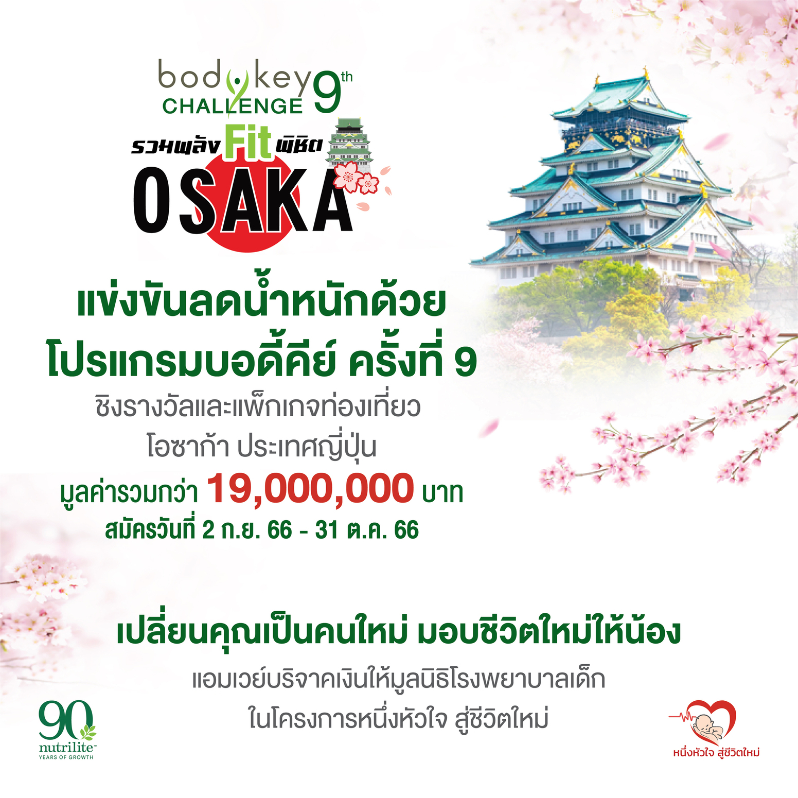 แอมเวย์ ร่วมฉลองก้าวสู่ปีที่ 90 ของแบรนด์ นิวทริไลท์ ที่มีการค้นคว้าวิจัยและพัฒนาอย่างพิถีพิถัน ล่าสุด เปิดแคมเปญแข่งขันลดน้ำหนัก กับ โปรแกรมบอดี้คีย์ ครั้งที่ 9 (BodyKey Challenge 9th) เปลี่ยนคุณเป็นคนใหม่ มอบชีวิตใหม่ให้น้อง เพราะทุกการลดน้ำหนักที่สำเร็จ แอมเวย์บริจาคเงิน 900 บาท เพื่อนำไปช่วยชีวิตเด็กทารกจากโรคหัวใจพิการขั้นวิกฤต ให้กับมูลนิธิโรงพยาบาลเด็ก ในโครงการหนึ่งหัวใจ สู่ชีวิตใหม่ พร้อมให้คุณได้ชิงแพ็กเกจท่องเที่ยว เมืองโอซาก้า ประเทศญี่ปุ่น และรางวัลพิเศษมากมาย มูลค่ารวมกว่า 19 ล้านบาท สำหรับผู้ที่สนใจเข้าร่วม “การแข่งขันลดน้ำหนักด้วยโปรแกรมบอดี้คีย์ ครั้งที่ 9” สามารถสมัครได้ตั้งแต่วันที่ 2 กันยายน – 31 ตุลาคม 2566