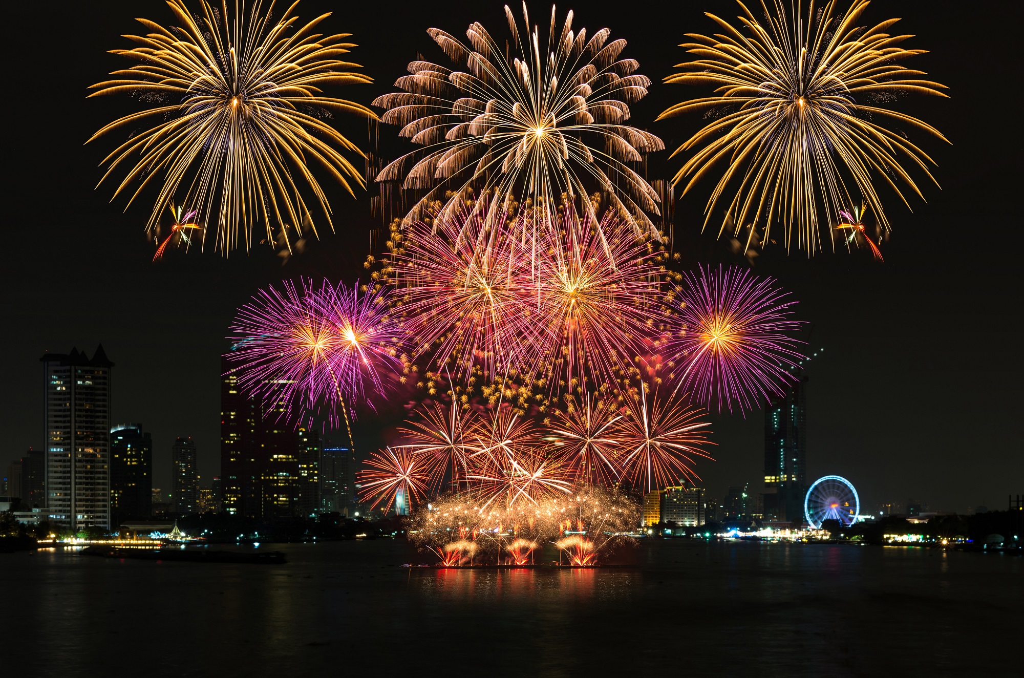 Amazing celebration fireworks over the river with bangkok cityscape soft focus background at night scene