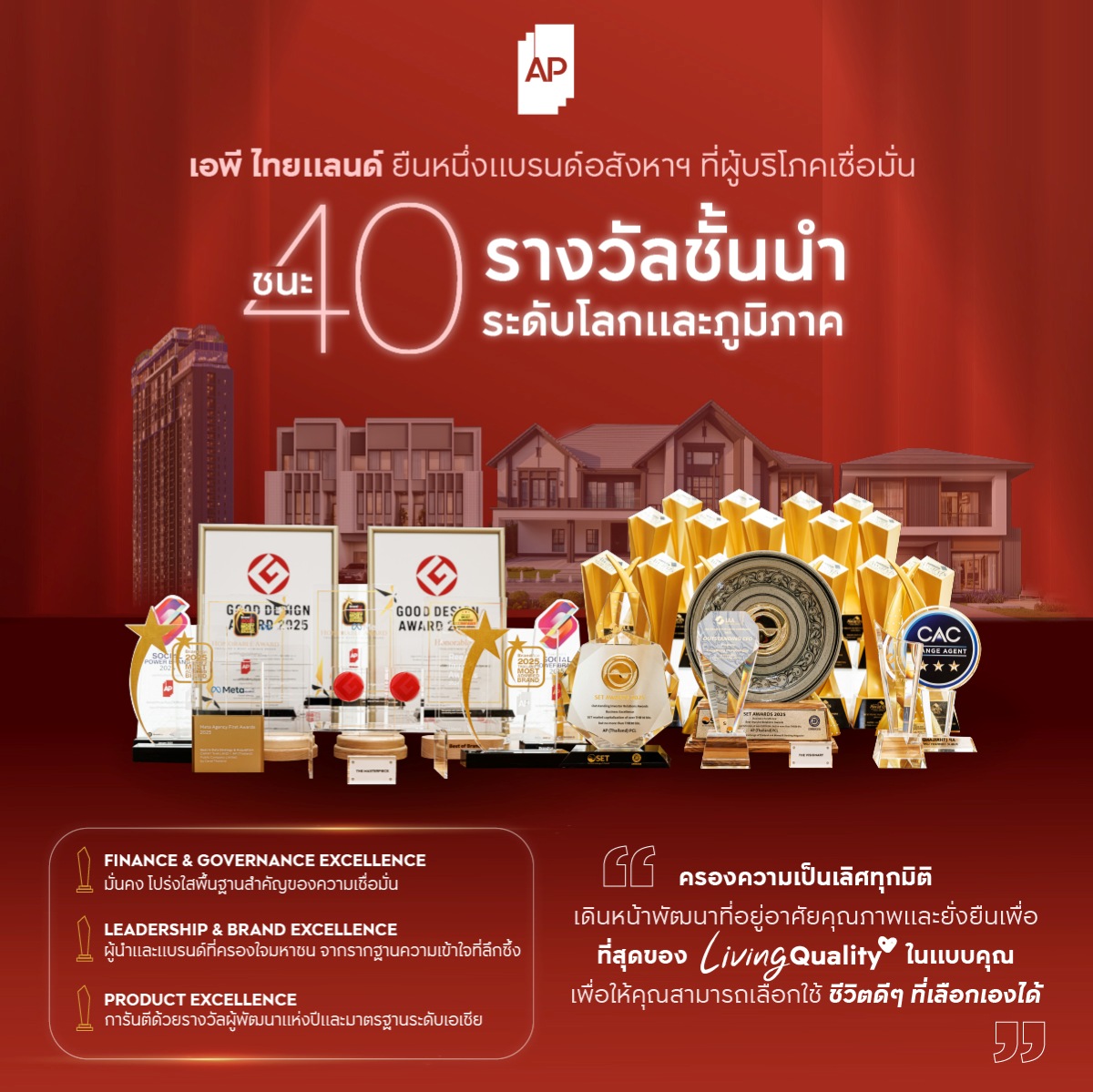 บริษัท เอพี ไทยแลนด์ จำกัด (มหาชน) เดินหน้าสร้างปรากฏการณ์สำคัญด้วยการชนะรางวัลยอดเยี่ยมจากสถาบันชั้นนำทั้งระดับประเทศและสากลตลอดปี 2568 รวมทั้งหมด 40 รางวัล สะท้อนความสำเร็จและความเป็นเลิศรอบด้าน ครอบคลุมตั้งแต่นวัตกรรมดีไซน์ที่อยู่อาศัย คุณภาพโครงการที่โดดเด่น ความแข็งแกร่งของแบรนด์ ไปจนถึงการบริหารจัดการธุรกิจและการเงินที่มีเสถียรภาพ โปร่งใส ภายใต้หลักธรรมาภิบาลและวิสัยทัศน์ผู้นำในอุตสาหกรรม ความสำเร็จนี้ไม่เพียงตอกย้ำสถานะของเอพีในฐานะองค์กรชั้นนำ แต่ยังเป็นเครื่องพิสูจน์ถึงความมุ่งมั่นในการยกระดับมาตรฐานอุตสาหกรรมอสังหาฯ ไทยสู่สากล พร้อมส่งมอบ ‘ที่สุดของ LIVING QUALITY ในแบบคุณ’ เพื่อเป้าหมายสูงสุดในการสร้าง ‘ชีวิตดีๆ ที่เลือกเองได้’ ให้กับลูกค้าและสังคมไทยอย่างยั่งยืน