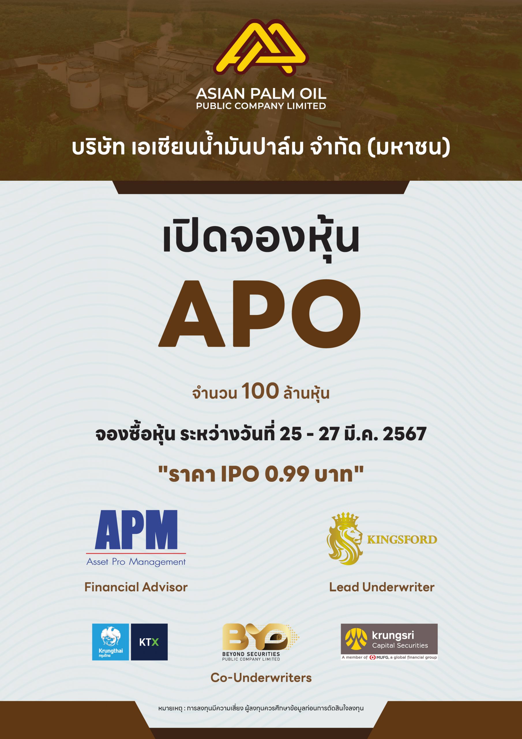“APO” บมจ. เอเชียนน้ำมันปาล์ม หุ้นน้องใหม่ไฟแรง นำทัพโดย CEO หนุ่มหล่อ สิทธิภาส อุดมผลกุล ประธานเจ้าหน้าที่บริหาร APO พร้อมด้วย FA ระดับเทพ สมศักดิ์ ศิริชัยนฤมิตร ประธานเจ้าหน้าที่บริหาร แห่ง APM ควง ดร. วรนันท์ ถาวรนันท์ กรรมการผู้จัดการ KFS ผู้จัดการการจัดจำหน่ายหุ้น เปิดจองซื้อหุ้น IPO 25-27 มีนาคมนี้ เตรียมเทรดตลาดหลักทรัพย์ mai วันแรก 2 เม.ย. 67