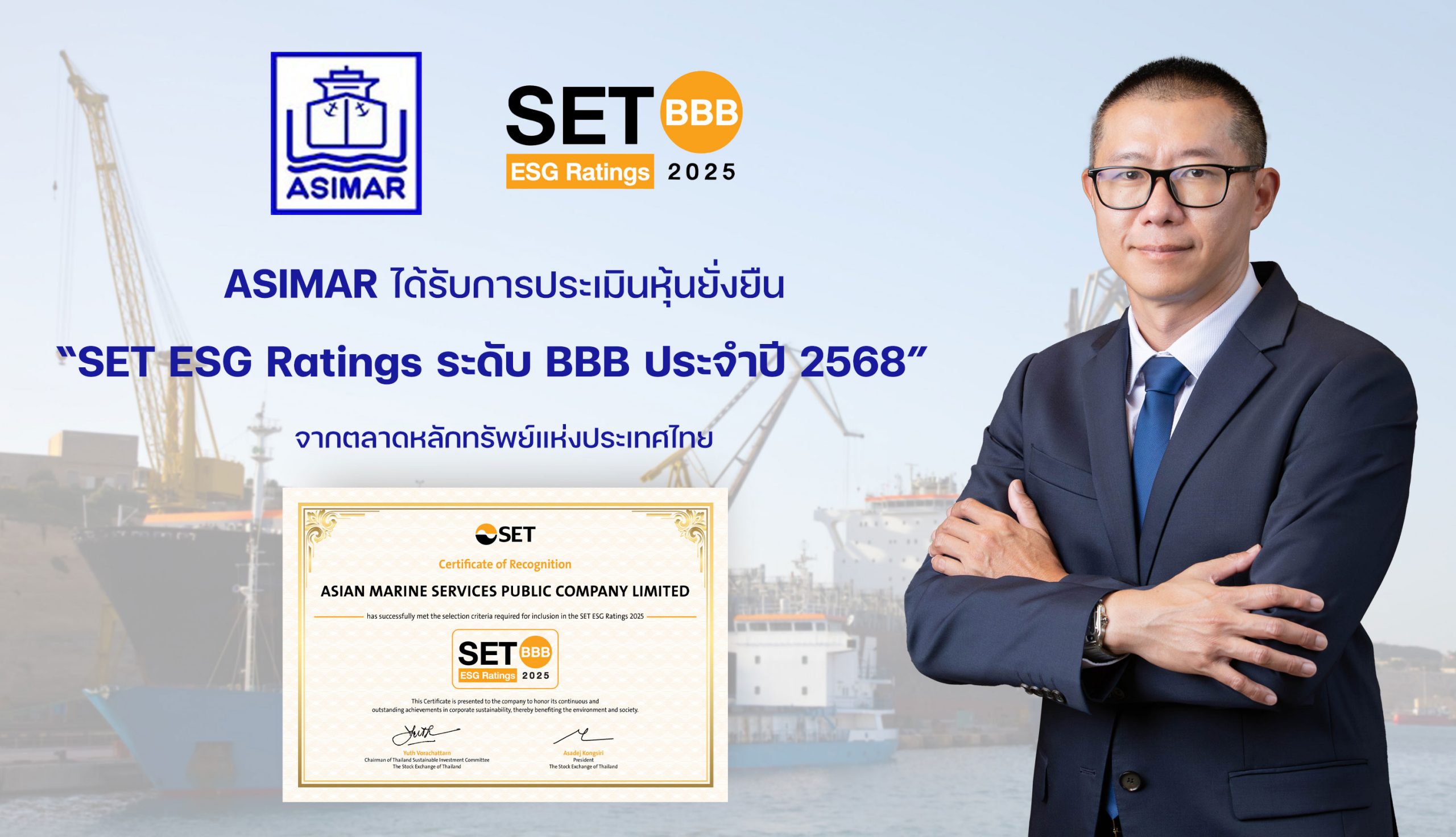 บริษัท เอเชียน มารีน เซอร์วิสส์ จำกัด (มหาชน) หรือ ASIMAR ได้รับการประเมินด้านความยั่งยืนจาก SET ESG Ratings ในระดับ “BBB” ประจำปี 2568 ซึ่งจัดทำโดย ตลาดหลักทรัพย์แห่งประเทศไทย การประเมินดังกล่าวสะท้อนถึงแนวทางการดำเนินธุรกิจของบริษัทที่ให้ความสำคัญกับการบูรณาการมิติด้านสิ่งแวดล้อม สังคม และการกำกับดูแลกิจการ (Environmental, Social and Governance: ESG) เข้ากับกระบวนการบริหารจัดการและการดำเนินงานขององค์กร ตามหลักเกณฑ์และมาตรฐานที่ตลาดหลักทรัพย์แห่งประเทศไทยกำหนด