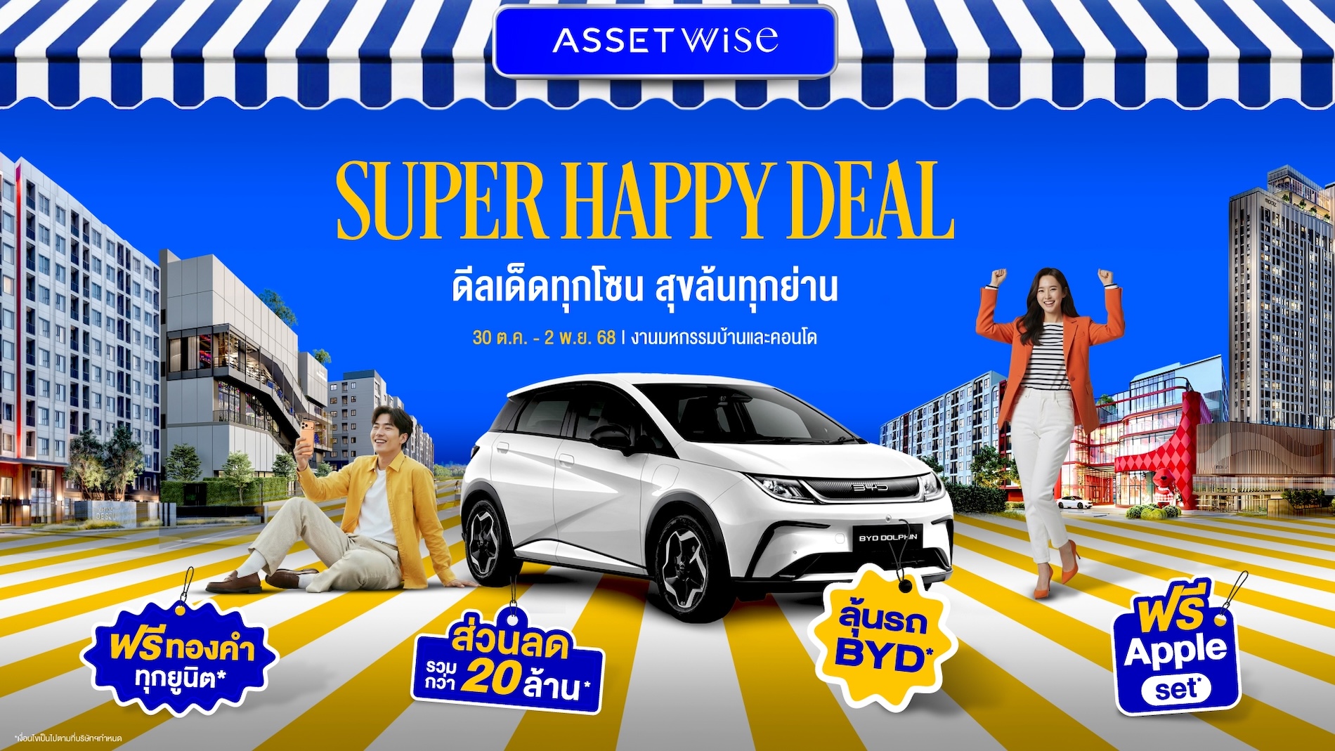 แอสเซทไวส์ แจกหนักจัดใหญ่ส่งท้ายปี จัดแคมเปญ “AssetWise Super Happy Deal” ดีลเด็ดทุกโซน สุขล้นทุกย่าน รวมโครงการบ้าน-คอนโดพรีเซลและพร้อมอยู่กว่า 34 โครงการ เริ่ม 1.29 ล้านบาท ครอบคลุมทุกโซนทำเลฮอต กทม. ปริมณฑล ชลบุรี และระยอง พร้อมคอนโดสายลงทุน ยูนิตสวยราคาพิเศษมาให้เลือกช้อปกันถึงในงานมหกรรมบ้านและคอนโด ครั้งที่ 48 พร้อมมอบดีลเด็ด ส่วนลดรวมกว่า 20 ล้านบาท ฟรี! ทองคำทุกยูนิต ฟรี! Apple Set จองปุ๊บรับทันที Gift Voucher 1,000 บาท และลุ้นรางวัลใหญ่ BYD Dolphin เอ็กซ์คลูซีฟเฉพาะในงานเท่านั้น!