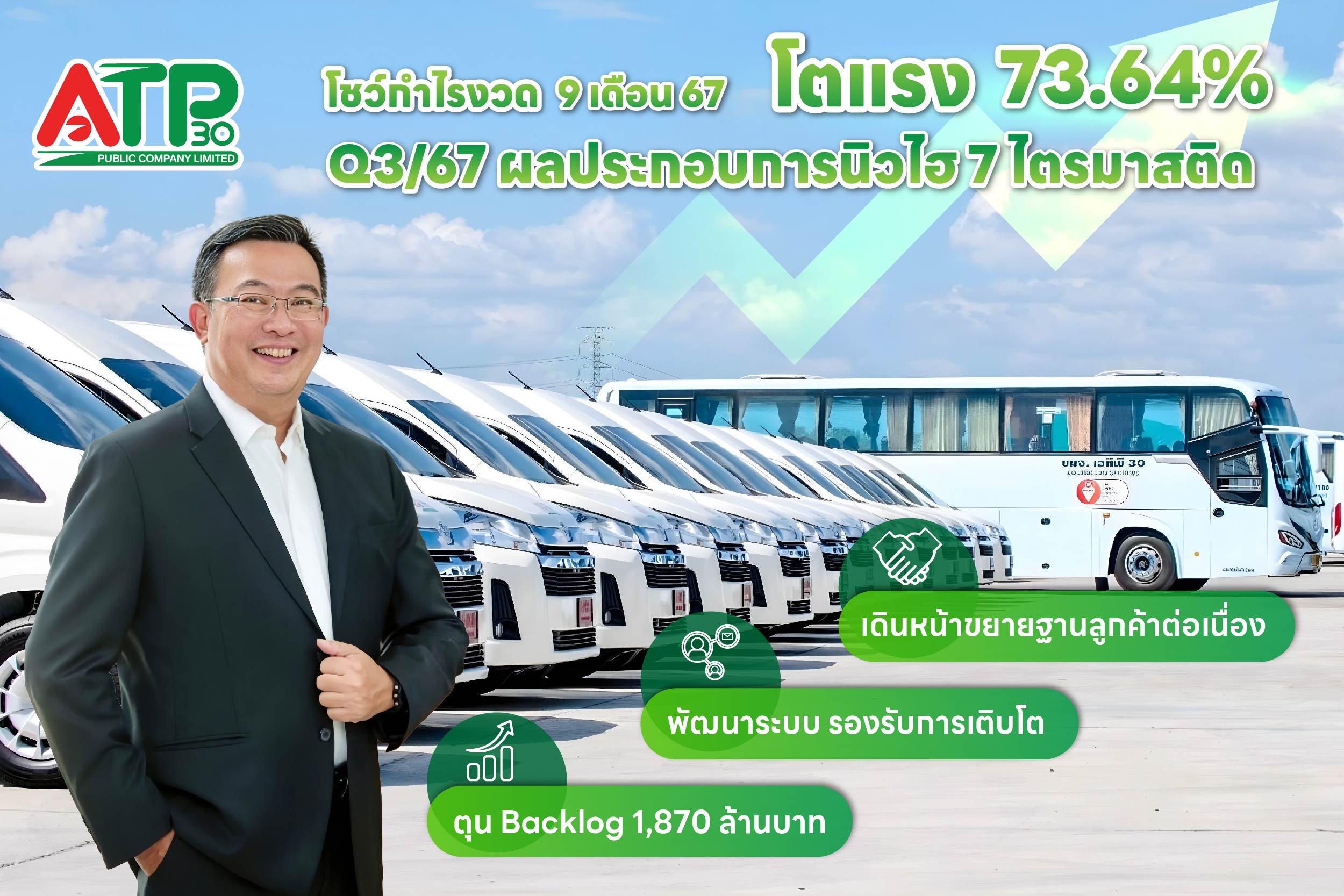 ATP30 เผยผลประกอบการงวด 9 เดือนปี 67 รายได้ 535.99 ล้านบาท กำไรสุทธิ 33.53 ล้านบาท โต 73.64% ไตรมาส 3 รายได้ เดินหน้าทำนิวไฮต่อเนื่องเป็นไตรมาสที่ 7 เริ่มรับรู้รายได้จากลูกค้าใหม่ในไตรมาส 4/67 มุ่งเน้นพัฒนาระบบ ขยายฐานลูกค้าเพิ่ม ดันผลประกอบการปี 67 โตตามเป้า