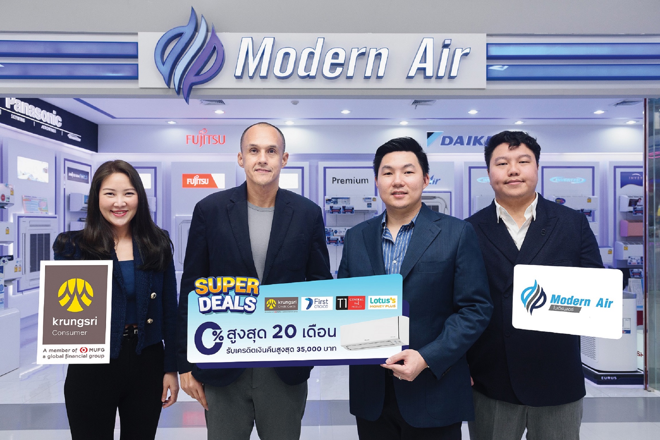 นายเกลนริชาร์ด แนกกลิส (ที่ 2 จากซ้าย) ผู้ช่วยกรรมการผู้จัดการใหญ่ ฝ่ายงานเครือข่ายการขายและฝ่ายการตลาดธุรกิจผ่อนชำระ บริษัท อยุธยา แคปปิตอล เซอร์วิสเซส จำกัด ในฐานะตัวแทนบัตรเครดิตและบัตรผ่อนชำระในเครือกรุงศรี คอนซูมเมอร์ ร่วมกับ นายธนายุต เยื่องศรีกุล (ที่ 2 จากขวา) ผู้ช่วยผู้จัดการทั่วไป บริษัท โมเดิร์นแอร์ จํากัด จัดโปรแรง “Super Deals” ที่ร้านโมเดิร์นแอร์ รับสิทธิ์ผ่อน 0% พร้อมรับเครดิตเงินคืนเพิ่มสูงสุด 35,000 บาท เมื่อซื้อเครื่องปรับอากาศและเครื่องฟอกอากาศแบรนด์ชั้นนำ พร้อมติดตั้งฟรีในเขตพื้นที่กรุงเทพและปริมณฑล และเลือกผ่อนชำระผ่านบัตรเครดิตในเครือกรุงศรี คอนซูมเมอร์ ตั้งแต่ 1 มีนาคม–31 พฤษภาคม 2567 รับสิทธิ์ผ่อน 0% นานสูงสุด 20 เดือน สำหรับสมาชิกบัตรกรุงศรีเฟิร์สช้อยส์ และนานสูงสุด 10 เดือน สำหรับสมาชิกบัตรเครดิต กรุงศรี, บัตรเครดิตเซ็นทรัล เดอะวัน และบัตรเครดิต โลตัส พิเศษ! เฉพาะสมาชิกบัตรเครดิตกรุงศรีเฟิร์สช้อยส์ วีซ่า แพลทินัม, เอ็กซ์ยู บัตรเครดิต ดิจิทัล และบัตรเครดิต กรุงศรี ทุกหน้าบัตร ใช้คะแนนสะสมแลกรับเครดิตเงินคืนเพิ่ม สูงสุด 15% หรือ 15,000 บาท ตลอดรายการ (เงื่อนไขเป็นไปตามที่บริษัทกำหนด)