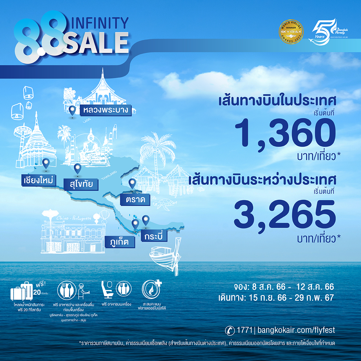 สายการบินบางกอกแอร์เวย์ส ออกโปรโมชั่น “8.8 Infinity Sale” เสนอบัตรโดยสารราคาพิเศษทั้งเส้นทางภายในประเทศ อาทิ สมุย เชียงใหม่ ภูเก็ต ตราด กระบี่ สุโขทัย และเส้นทางระหว่างประเทศ ได้แก่ หลวงพระบาง (สปป.ลาว) บัตรโดยสารภายในประเทศราคาเริ่มต้นที่ 1,360 บาท ต่อเที่ยว* และเส้นทางบินระหว่างประเทศ เริ่มต้นที่ 3,265 บาท/เที่ยว* (ราคาดังกล่าวรวมภาษีสนามบิน ค่าธรรมเนียมออกบัตรโดยสาร และค่าธรรมเนียมเชื้อเพลิง) เปิดจองพร้อมกันทางเว็บไซต์ www.bangkokair.com/flyfest ระหว่างวันที่ 8-12 สิงหาคม นี้เท่านั้น และบัตรโดยสารสามารถใช้เดินทางได้ตั้งแต่วันที่ 15 กันยายน 2566 – 29 กุมภาพันธ์ 2567 (เงื่อนไขเป็นไปตามที่บริษัทฯ กำหนด)