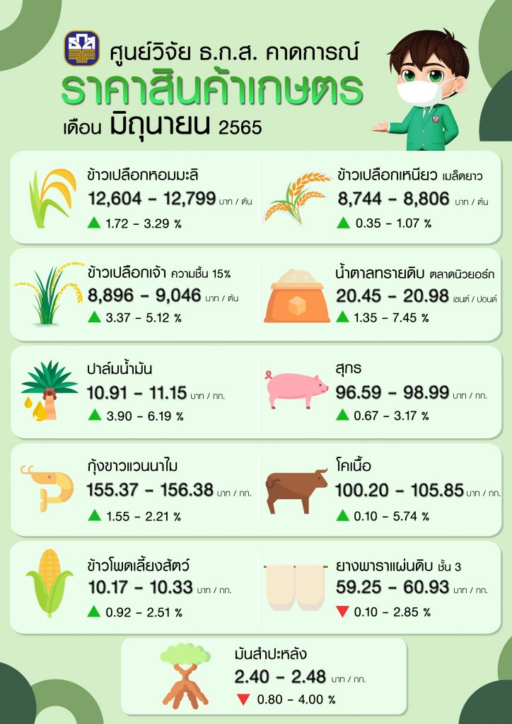 ศูนย์วิจัยและพัฒนานวัตกรรม ธ.ก.ส. เผยราคาสินค้าเกษตรในเดือนมิถุนายน 2565 มีแนวโน้มปรับตัวสูงขึ้น เนื่องจากมาตรการเปิดประเทศ เปิดสถานบันเทิง และค่าเงินบาทอ่อนค่าลงส่งผลให้ราคาสินค้าเกษตรเพิ่มขึ้น ได้แก่ ข้าวเปลือกเจ้า ข้าวเปลือกหอมมะลิ ข้าวเปลือกเหนียวเมล็ดยาว ข้าวโพดเลี้ยงสัตว์ น้ำตาลทรายดิบ ปาล์มน้ำมัน สุกร โคเนื้อ และกุ้งขาว แวนนาไม ยกเว้นมันสำปะหลัง และยางพาราดิบที่มีแนวโน้มราคาปรับลดลง
