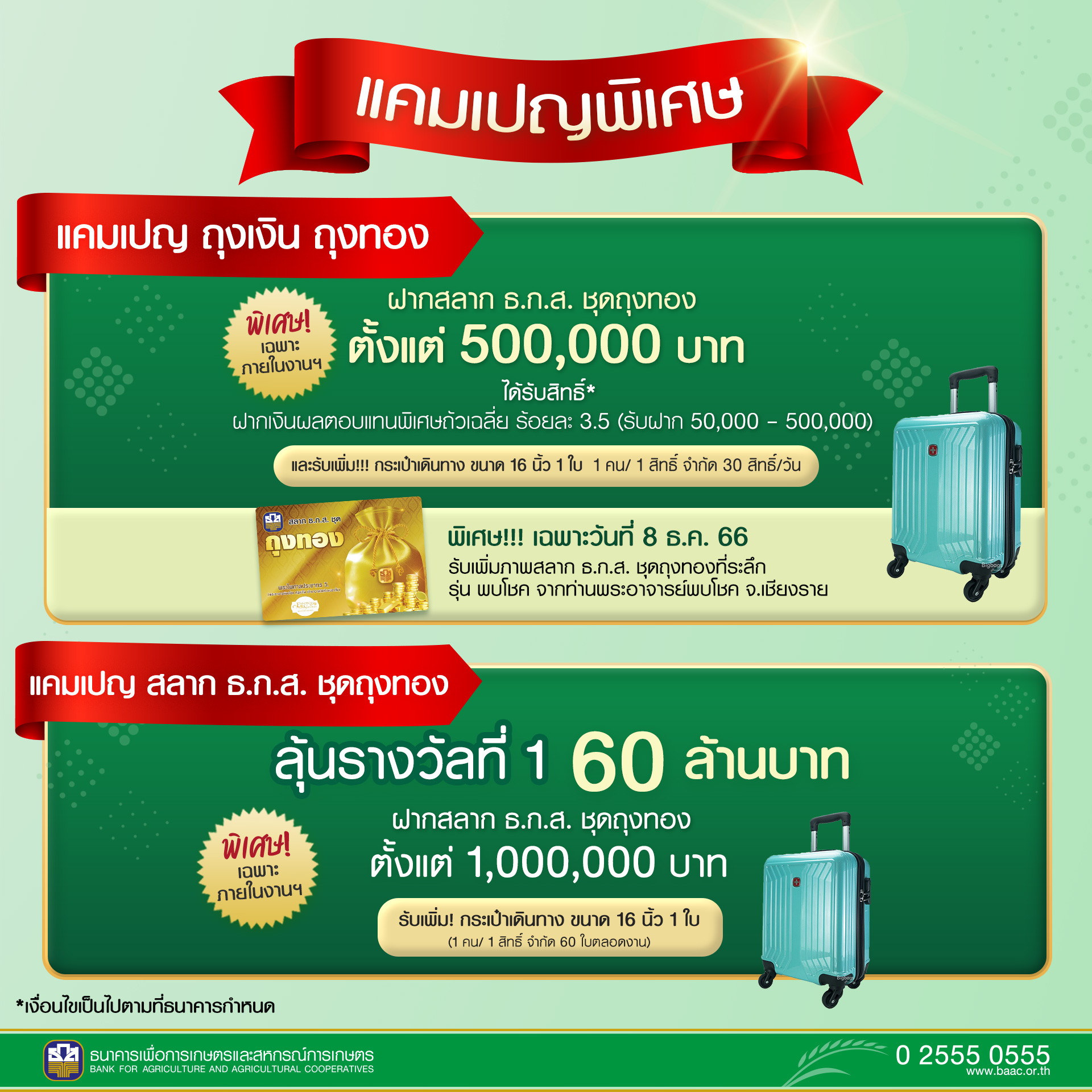 นายไพศาล หงษ์ทอง ผู้ช่วยผู้จัดการและโฆษกธนาคารเพื่อการเกษตรและสหกรณ์การเกษตร (ธ.ก.ส.) เปิดเผยว่า ธ.ก.ส. เข้าร่วมงาน Thailand Smart Money Bangkok 2023 ซึ่งจัดขึ้นระหว่างวันที่ 8 – 10 ธันวาคม 2566 ณ BCC Hall ศูนย์การค้าเซ็นทรัล ลาดพร้าว กรุงเทพฯ พร้อมขนแคมเปญพิเศษมากมาย โดยเฉพาะ แคมเปญ “ถุงเงิน ถุงทอง” เมื่อฝากสลาก ธ.ก.ส. ชุดถุงทอง ตั้งแต่ 500,000 บาทขึ้นไป รับสิทธิ์ฝากเงินผลตอบแทนพิเศษ เฉลี่ยร้อยละ 3.5 เมื่อเปิดบัญชีเงินฝากพิเศษตามเงื่อนไขแล้วรับทันที กระเป๋าเดินทางล้อลาก ขนาด 16 นิ้ว 1 ใบ และคะแนน A-Rewards 1,000 คะแนน (จำนวน 1 คน/สิทธิ์ จำกัด 30 สิทธิ์ต่อวัน) และแคมเปญ “สลาก ธ.ก.ส.ชุดถุงทอง” เมื่อฝากสลากตั้งแต่ 1,000,000 บาทขึ้นไป ภายในงาน รับกระเป๋าเดินทาง ขนาด 60 นิ้ว 1 ใบ (จำกัด 1 คน/สิทธิ์ จำกัด 60 ใบตลอดงาน) นอกจากนี้ ยังมีแคมเปญ “ผลิตโชค 60 ล้าน ลุ้นกับเป๊ก 24 ครั้ง” เมื่อฝากสลากทุก ๆ 2,000 บาท ผ่านแอปพลิเคชัน BAAC Mobile หรือเคาน์เตอร์ ธ.ก.ส. แล้วลงทะเบียนรับสิทธิ์ผ่านลิงก์ https://forms.gle/87iTUs8Ej4jcfLh38 จะได้รับ 1 สิทธิ์ในการลุ้น Lucky Draw เป็นผู้โชคดีในการเข้าร่วมงานกับคุณเป๊ก ผลิตโชค จำนวน 30 รางวัล (ผู้ฝากต้องมีสัญชาติไทยเท่านั้น ซึ่งดำเนินการฝากสลากและลงทะเบียนรับสิทธิ์ ตั้งแต่วันที่ 30 พฤศจิกายนจนถึงวันที่ 14 ธันวาคม 2566 ภายในเวลา 12.00 น. ไม่จำกัดสิทธิ์ในการฝาก) โดยธนาคารจะทำการจับรางวัลและประกาศรายชื่อผู้โชคดีในวันที่ 15 ธันวาคม 2566 ผ่านทาง Facebook : ธกส BAAC Thailand และ Line Official : BAAC Family สำหรับเข้าร่วมกิจกรรมเปิดตัวพรีเซนเตอร์ในวันที่ 17 ธันวาคม 2566 ณ ชั้น 2 อาคารทาวเวอร์ ธ.ก.ส. สำนักงานใหญ่ กรุงเทพมหานคร แล้วมาร่วมเปิดโชค เปิดความสนุกสนานที่มีแต่ได้กับได้ และไม่เสียทุน พร้อมลุ้นรางวัล Grand Prize ถึง 60 ล้าน และรางวัล อื่น ๆ รวมมูลค่าสูงสุดต่องวด 77,650,000 บาท โดยสลากทุก ๆ หน่วยลุ้นรางวัลได้ถึง 24 ครั้ง อายุรับฝาก 2 ปี ครบกำหนด รับดอกเบี้ย หน่วยละ 35 บาท ผู้โชคดีคนต่อไปอาจเป็นคุณ!