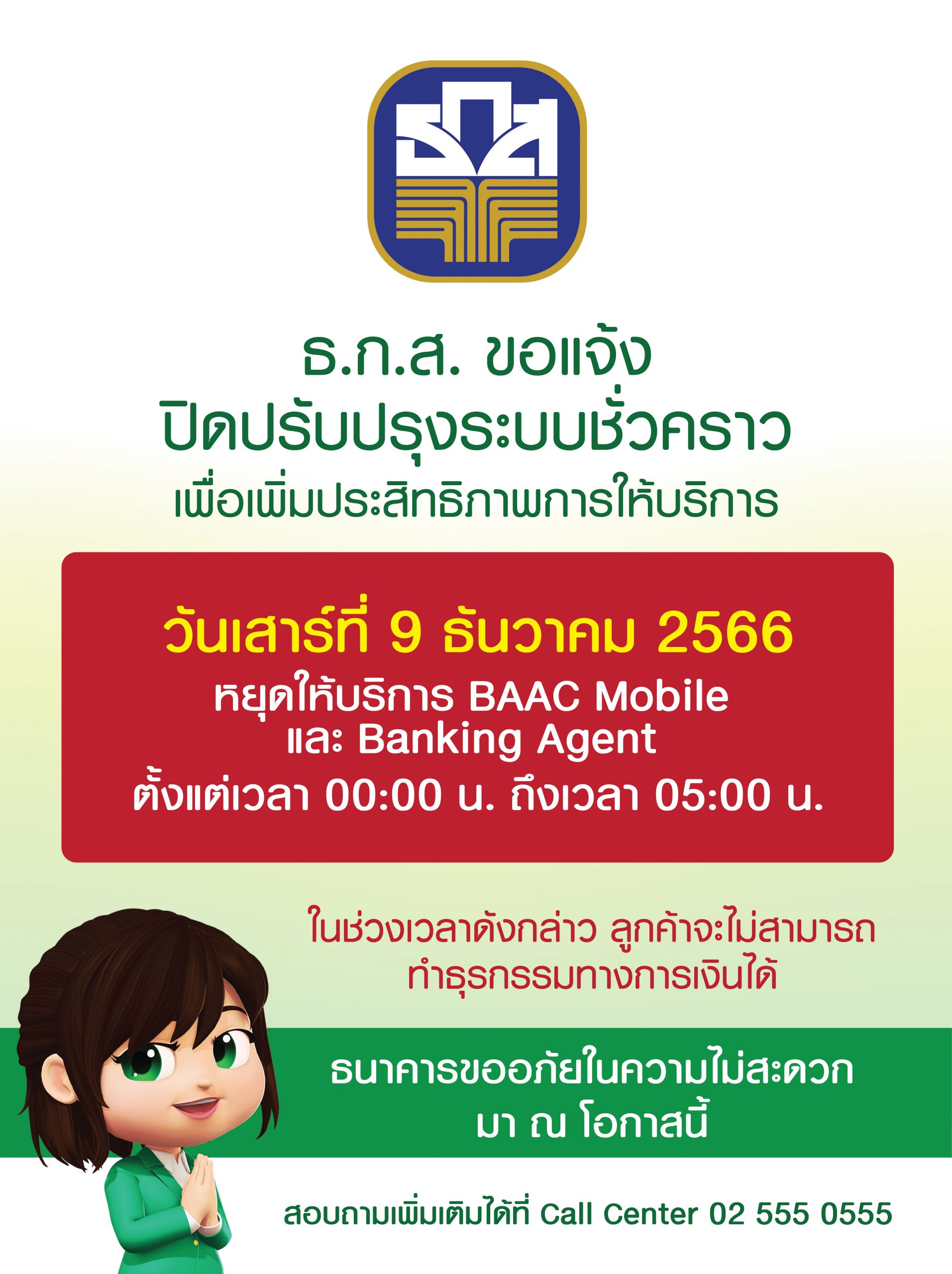 ธนาคารเพื่อการเกษตรและสหกรณ์การเกษตร (ธ.ก.ส.) แจ้งหยุดบริการธุรกรรมทุกช่องทางชั่วคราว ได้แก่ แอปพลิเคชัน BAAC Mobile และระบบ Banking Agent ในวันที่ 9 ธันวาคม 2566 ตั้งแต่เวลา 00.00 น. จนถึงเวลา 05.00 น. รวม 5 ชั่วโมง เพื่อปรับปรุงและเพิ่มประสิทธิภาพระบบการให้บริการและรองรับธุรกรรมที่มีปริมาณมากขึ้นในอนาคต โดยลูกค้าจะไม่สามารถทำธุรกรรมผ่านแอปพลิเคชัน BAAC Mobile และระบบ Banking Agent ได้ในช่วงเวลาดังกล่าว อย่างไรก็ตาม ธ.ก.ส. ขอขอบพระคุณ และขออภัยในความไม่สะดวกมา ณ ที่นี้