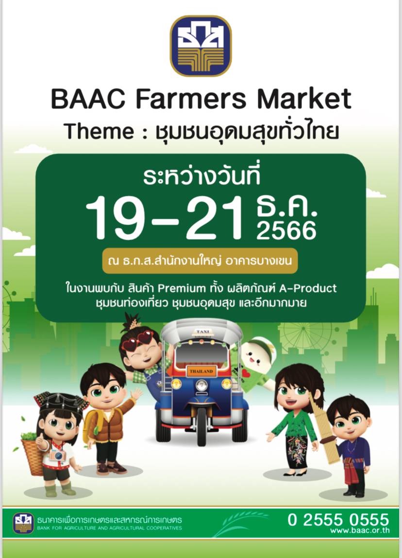 ธ.ก.ส. ชวนช้อปชุดของขวัญปีใหม่ที่ควรค่าต่อการส่งมอบความสุขให้กับคนพิเศษ แถมยังส่งต่อกำลังใจและสร้างเศรษฐกิจที่ดีคืนกลับสู่ชุมชน พบสินค้าเกษตรและผลิตภัณฑ์คุณภาพมาตรฐาน A-Product กว่า 40 ร้านค้าในงาน BAAC Farmers Market ที่มาในธีมชุมชนอุดมสุขทั่วไทย ที่ส่งตรงจากแหล่งผลิตมาให้เลือกซื้อ ณ บริเวณด้านหน้า ธ.ก.ส. สำนักงานใหญ่ กรุงเทพมหานคร ระหว่างวันที่ 19 – 21 ธันวาคมนี้