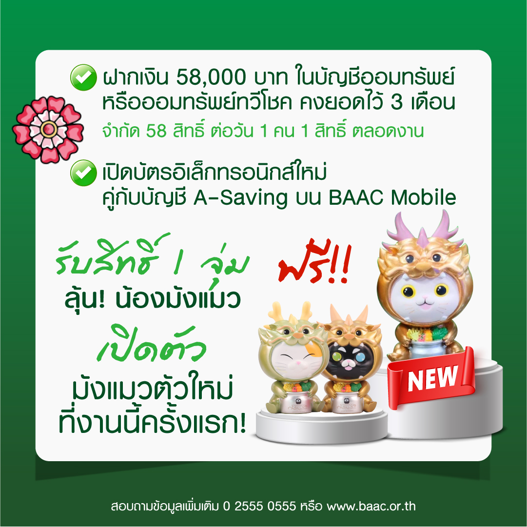 พิเศษเฉพาะในงาน! เมื่อฝากสลากออมทรัพย์ ธ.ก.ส. ชุดถุงเงิน ชุดขวัญถุง หรือสลากดิจิทัล ธ.ก.ส. ฝากตั้งแต่ 2,000 บาท ไม่เกิน 100,000 บาท รับกระปุก A-Pigeon หรือฝากสลากฯ เกิน 100,000 แต่ไม่เกิน 500,000 บาท รับกระปุก คุณ ME กึ๋น หรือฝากเกิน 500,000 ขึ้นไป รับทันที เซ็ตกระปุก คุณ ME จำนวน 1 เซ็ต นอกจากนี้ หรือเมื่อฝากเงินบัญชีออมทรัพย์หรือออมทรัพย์ทวีโชค ตั้งแต่ 58,000 บาทขึ้นไป และคงยอดเงินไว้ 3 เดือน รับสิทธิ์จุ่ม มังแมว 1 ตัว (1 บัญชี/สิทธิ์ จำกัด 58 สิทธิ์ต่อวัน) หรือเมื่อเปิดบัญชี A-Savings คู่กับบัตรอิเล็กทรอนิกส์ บนแอปพลิเคชัน BAAC Mobile รับสิทธิ์จุ่ม มังแมว 1 ตัว (1 บัญชี/สิทธิ์) หรือเมื่อสมัครใช้ BAAC Mobile ภายในงาน รับสิทธิ์ 2 ต่อ ต่อที่ 1 รับทันทีแผ่นทองพระแม่โพสพ พร้อมกระเป๋าใส่บัตร และต่อที่ 2 เมื่อลงทะเบียนเข้าร่วมแคมเปญ และมียอดการทำธุรกรรมสะสมสูงสุด 50 ลำดับแรก ตั้งแต่วันนี้จนถึง 31 สิงหาคม 2567 รับฟรี! บัตรของขวัญโลตัส มูลค่า 100 บาท (เงื่อนไขเป็นไปตามที่ธนาคารกำหนด)