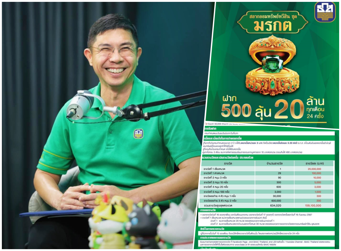 ธ.ก.ส. ขอขอบคุณลูกค้าและผู้มีอุปการคุณทุกท่านที่ให้ความไว้วางใจและสนับสนุนผลิตภัณฑ์เงินฝากของธนาคาร ซึ่งธนาคารจะนำเงินดังกล่าวไปสนับสนุนเกษตรกรในการลงทุนและการผลิตในภาคการเกษตร เพื่อสร้างความแข็งแกร่งให้ระบบเศรษฐกิจและความมั่นคงทางด้านอาหารให้กับประเทศต่อไป ซึ่งสลากออมทรัพย์ทวีสิน ชุดมรกต มีอายุการรับฝาก 2 ปี เมื่อฝากครบกำหนด จะได้รับดอกเบี้ยหน่วยละ 3 บาท คิดเป็นอัตราดอกเบี้ย ร้อยละ 0.30 ต่อปี และมีสิทธิ์ลุ้นรางวัลที่ 1 เสี่ยงหมวด มูลค่า 20,000,000 บาทและรางวัลอื่นๆ จำนวน 634,020 รางวัล เป็นเงิน 159,100,000 บาทต่อเดือน จำนวน 24 ครั้ง ได้แก่ รางวัลที่ 1 ต่างหมวด จำนวน 29 รางวัล รางวัลละ 100,000 บาท รางวัลที่ 2 จำนวน 90 รางวัล รางวัลละ 10,000 บาท รางวัลที่ 3 จำนวน 300 รางวัล รางวัลละ 5,000 บาท รางวัลที่ 4 จำนวน 600 รางวัล รางวัลละ 3,000 บาท รางวัลที่ 5 จำนวน 3,000 รางวัล รางวัลละ 1,000 บาท รางวัลเลขท้าย 4 ตัว จำนวน 30,000 รางวัล รางวัลละ 300 บาท และรางวัลเลขท้าย 3 ตัว จำนวน 600,000 รางวัล รางวัลละ 200 บาท ทั้งนี้ เมื่อฝากสลากฯ 500,000 บาทขึ้นไป การันตีผลตอบแทน 400 บาทต่อเดือน ผลตอบแทนรวมเมื่อครบกำหนด 12,600 บาท และยังได้รับการยกเว้นภาษีสำหรับบุคคลธรรมดาและนำไปใช้เป็นหลักประกันเงินกู้ของ ธ.ก.ส. ได้อีกด้วย
