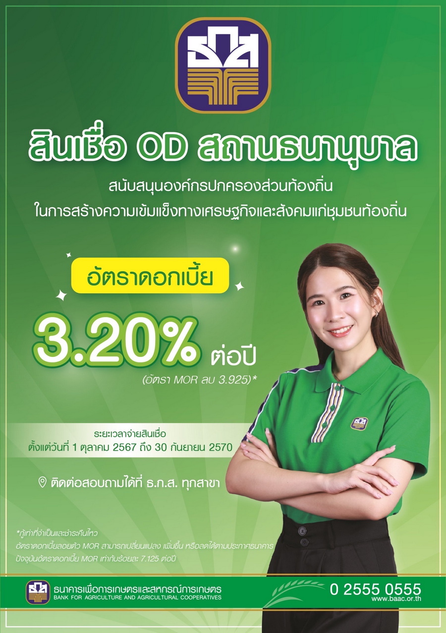 ธ.ก.ส. เติม 3.5 พันล้าน จัดสินเชื่อ OD สำหรับองค์กรปกครองส่วนท้องถิ่นที่ดำเนินกิจการสถานธนานุบาล เพื่อใช้เป็นเงินทุนหมุนเวียนและเสริมสภาพคล่องธุรกิจ สร้างความเข้มแข็งทางสังคมและเศรษฐกิจ ลดการพึ่งพาหนี้นอกระบบ และสร้างโอกาสในการลงทุนให้แก่คนในชุมชน อัตราดอกเบี้ยร้อยละ 3.20 ต่อปี เปิดแจ้งความประสงค์ได้ตั้งแต่วันนี้เป็นต้นไป