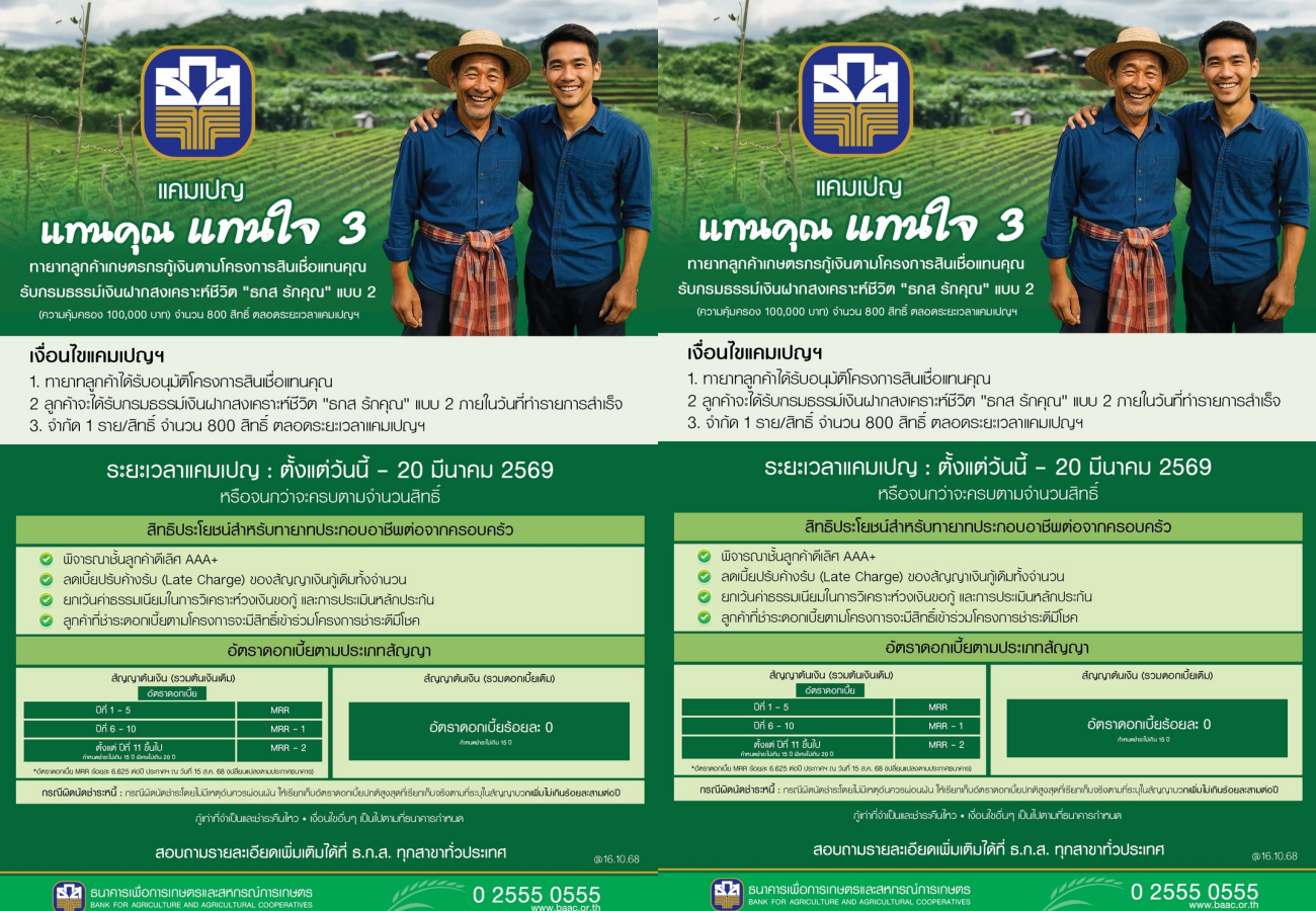 ธนาคารเพื่อการเกษตรและสหกรณ์การเกษตร (ธ.ก.ส.) จัดแคมเปญแทนคุณ แทนใจ 3 สำหรับลูกค้าที่ใช้บริการสินเชื่อแทนคุณ ที่เปิดโอกาสให้ทายาทเข้ามามีส่วนร่วมในการแก้ไขหนี้สินครัวเรือนให้กับเกษตรกรลูกค้าที่อายุตั้งแต่ 60 ปีขึ้นไป ที่พร้อมโอนทรัพย์สินหลักประกันให้กับทายาท เพื่อรักษาทรัพย์สินให้คงอยู่กับครอบครัว โดย ธ.ก.ส. จะจ่ายสินเชื่อให้ทายาทที่มารับช่วงในการประกอบอาชีพในอัตราพิเศษ พร้อมมอบสิทธิพิเศษเมื่อสินเชื่อได้รับการอนุมัติ รับทันที ความคุ้มครองชีวิตผ่านกรมธรรม์เงินฝากสงเคราะห์ชีวิต ธกส รักคุณ แบบ 2 (มูลค่า 399 บาท) พร้อมให้ความคุ้มครองสูงสุด 100,000 บาท เพียงสแกน QR Code ลงทะเบียนรับสิทธิ์ ณ สาขาที่ขอสินเชื่อ (จำกัด 800 สิทธิ์ ตลอดระยะแคมเปญ) ลงทะเบียนได้เลยตั้งแต่บัดนี้จนถึง 20 มีนาคม 2569