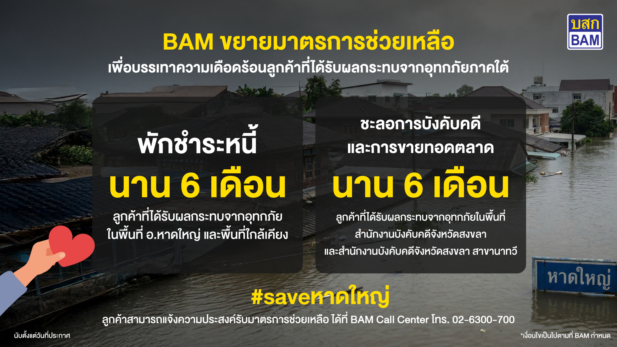 BAM ห่วงใยลูกค้าที่ได้รับผลกระทบจากเหตุการณ์น้ำท่วมใหญ่ในเขตอำเภอหาดใหญ่ และพื้นที่ภาคใต้ พร้อมขยายมาตรการเพิ่มเติมหลังลงพื้นที่พบความเสียหายในวงกว้าง ด้วยมาตรการพักชำระหนี้ ชะลอการบังคับคดี และการขายทอดตลาด นาน 6 เดือน เพื่อบรรเทาความเดือดร้อนของลูกค้า