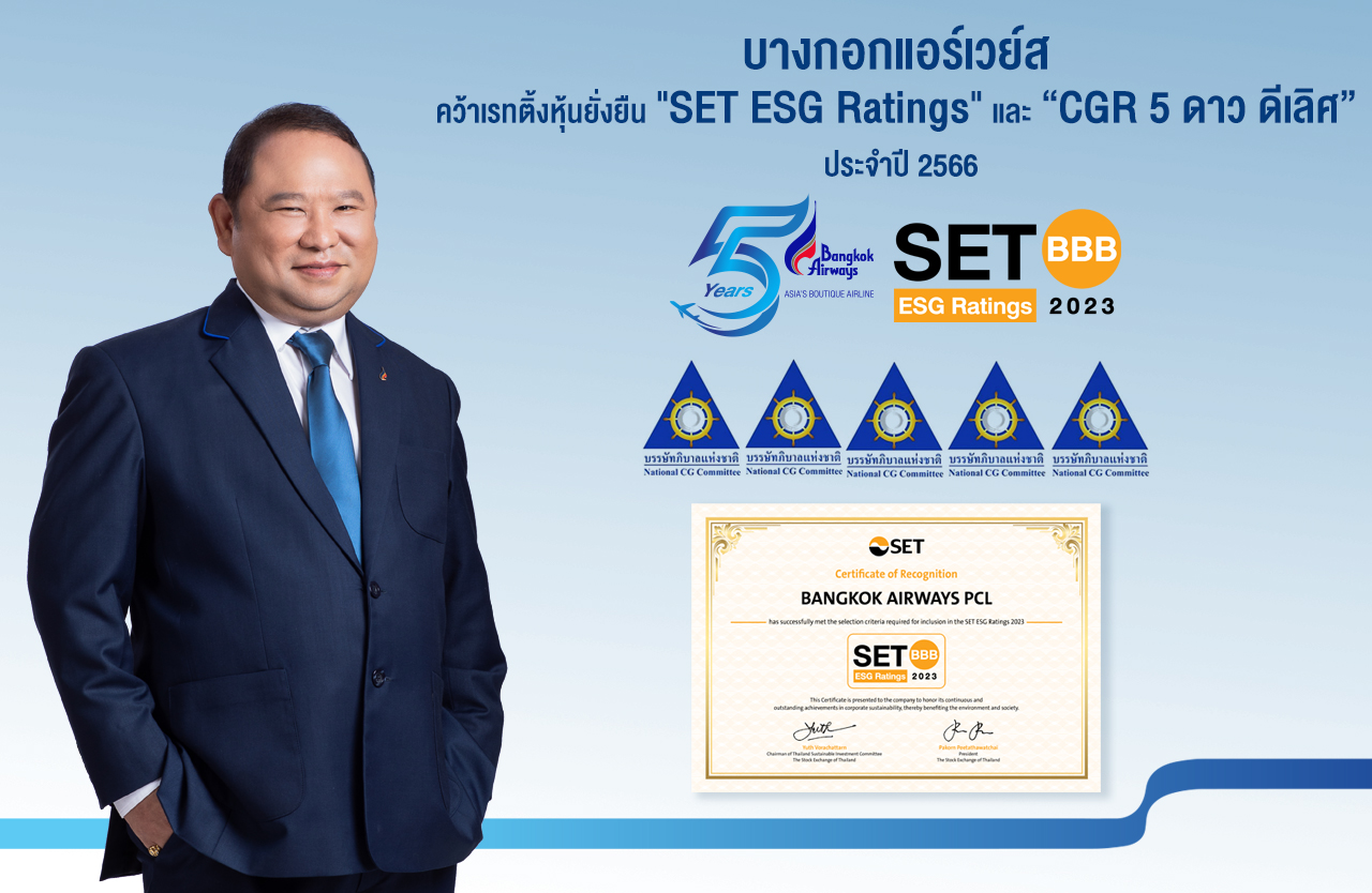 “เพื่อเป็นการการันตีถึงการดำเนินธุรกิจตามกรอบธรรมาภิบาล และการขับเคลื่อนธุรกิจที่ให้ความสำคัญทั้งมิติเศรษฐกิจ สังคม และสิ่งแวดล้อม ล่าสุดบริษัทฯ มีความภาคภูมิใจที่ได้รับการพิจารณาคัดเลือกเป็นหนึ่งในรายชื่อหุ้นยั่งยืน ประจำปี 2566 “SET ESG Ratings 2023” ระดับ BBB ในกลุ่มธุรกิจบริการ (Services) จากตลาดหลักทรัพย์แห่งประเทศไทย และได้รับคะแนน CGR บริษัทจดทะเบียนที่มีการกำกับดูแลกิจการระดับ 5 ดาว “ดีเลิศ” (Excellent CG Scoring) จากสมาคมส่งเสริมสถาบันกรรมการบริษัทไทย (IOD) โดยการสนับสนุนจากตลาดหลักทรัพย์แห่งประเทศไทย ซึ่งสะท้อนถึงการดำเนินธุรกิจที่มุ่งเน้นเรื่องการกำกับดูแลกิจการที่ดี อีกทั้งยังได้รับการพิจารณาผ่านเกณฑ์ประเมินสำหรับรางวัลการันตี “ดาวแห่งความยั่งยืน” ระดับ 5 ดาว ในโครงการ STAR : Sustainable Tourism Acceleration Rating โดยการท่องเที่ยวแห่งประเทศไทย (ททท.) เพื่อยกระดับมาตรฐานการท่องเที่ยวยั่งยืน  และรางวัลการันตีด้านสิ่งแวดล้อมโดยได้รับประกาศนียบัตร “EIA Symposium and Monitoring Awards 2023” ซึ่งสนามบินสุโขทัย-สนามบินสมุยได้รับรางวัลยอดเยี่ยม – ดีเด่น ในโครงการที่ปฏิบัติตามมาตรการในรายงานการประเมินผลกระทบสิ่งแวดล้อม ประจำปี 2566  เพื่อสร้างคุณค่าร่วมให้กับผู้มีส่วนได้เสียและสร้างการเติบโตให้กับธุรกิจพร้อมมุ่งมั่นพัฒนาการดำเนินธุรกิจสู่การเปลี่ยนผ่านเป็นหนึ่งในสายการบินรักษ์โลกอย่างเต็มขั้นต่อไปในอนาคต”