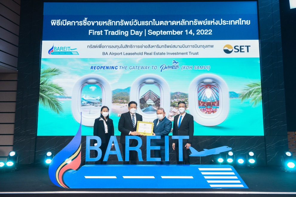 ทรัสต์เพื่อการลงทุนในสิทธิการเช่าอสังหาริมทรัพย์สนามบินการบินกรุงเทพ หรือ BAREIT นำหน่วยทรัสต์เข้าเทรดในตลาดหลักทรัพย์แห่งประเทศไทยวันที่ 14 ก.ย.นี้ ภายใต้ชื่อย่อ BAREIT ชี้กระแสตอบรับดีจากนักลงทุนสถาบันและนักลงทุนรายย่อยในการเสนอขายหน่วยทรัสต์ที่ผ่านมา ชูจุดเด่นลงทุนในทรัพย์สินสนามบินสมุย เกตเวย์สู่แหล่งท่องเที่ยวระดับเวิลด์คลาส รับประโยชน์จากอุตสาหกรรมท่องเที่ยวฟื้นตัว ประมาณการผลตอบแทนปีแรก 8.09%
