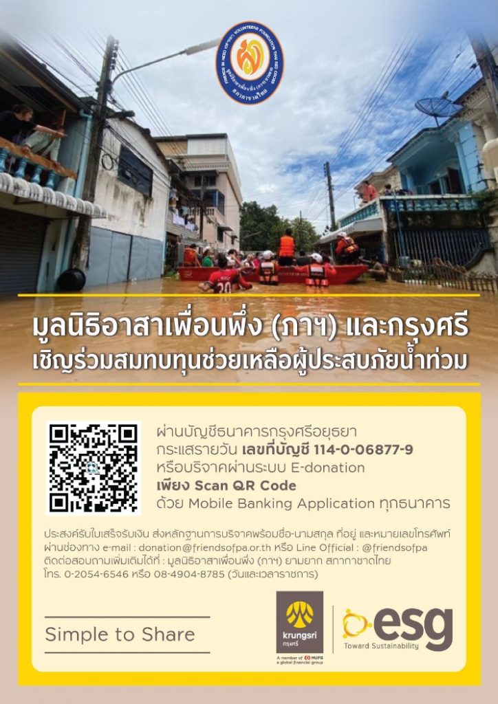 มูลนิธิอาสาเพื่อนพึ่ง (ภาฯ) ยามยาก สภากาชาดไทย ร่วมกับ ธนาคารกรุงศรีอยุธยา จำกัด (มหาชน) ขอเชิญชวนร่วมบริจาคและสมทบทุน เพื่อช่วยเหลือเยียวยาผู้ประสบภัยน้ำท่วมในพื้นที่จังหวัดต่าง ๆ ผ่านบัญชีธนาคารกรุงศรีอยุธยา กระแสรายวัน เลขที่บัญชี 114-0-06877-9 หรือบริจาคผ่านระบบ E-Donation ด้วยการสแกน QR Code
