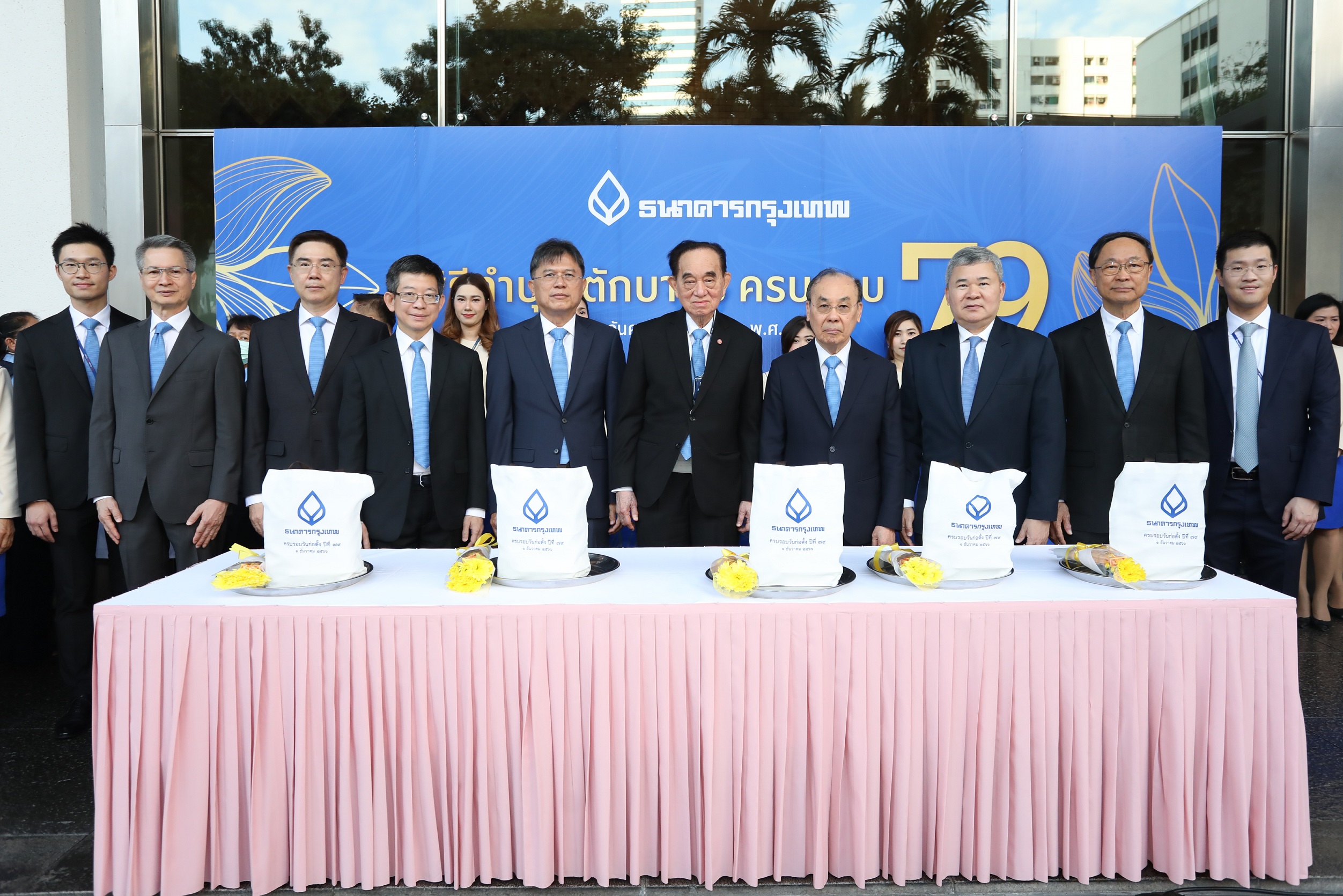 นายสิงห์ ตังทัตสวัสดิ์ (ที่ 5 จากซ้าย) รองประธานกรรมการบริหาร นายชาติศิริ โสภณพนิช (ที่ 4 จากซ้าย) กรรมการผู้จัดการใหญ่ นายอมร จันทรสมบูรณ์ (ที่ 6 จากซ้าย) นายโชคชัย นิลเจียรสกุล (ที่ 5 จากขวา) นายพิเชฐ ดุรงคเวโรจน์ (ที่ 4 จากขวา) นายบัณฑิต เอื้ออาภรณ์ (ที่ 3 จากขวา) นายปรีดี ดาวฉาย (ที่ 3 จากซ้าย) นายจรัมพร โชติกเสถียร (ที่ 2 จากซ้าย) กรรมการธนาคาร นายกอบศักดิ์ ภูตระกูล (ที่ 2 จากขวา) กรรมการรองผู้จัดการใหญ่และเลขานุการบริษัท นายชานนท์ โสภณพนิช (ที่ 1 จากขวา) เจ้าหน้าที่บริหารระดับ Vice President ผู้จัดการธุรกิจพลังงาน นายชานันท์ โสภณพนิช (ที่ 1 จากซ้าย) เจ้าหน้าที่บริหารระดับ Assistant Vice President บริหารช่องทาง Mobile Banking พร้อมคณะผู้บริหารและพนักงาน ธนาคารกรุงเทพ จำกัด (มหาชน) ร่วมทำบุญตักบาตรพระสงฆ์ 100 รูป ในโอกาสวันคล้ายวันก่อตั้งธนาคารครบปีที่ 79 ซึ่งตรงกับวันที่ 1 ธันวาคมของทุกปี โดยในปี 2566 นี้ ธนาคารได้นิมนต์พระสงฆ์จาก 6 วัดพระอารามหลวง ประกอบด้วย วัดพระเชตุพนวิมลมังคลารามราชวรมหาวิหาร วัดเทพศิรินทราวาสราชวรวิหาร วัดไตรมิตรวิทยารามวรวิหาร วัดปทุมคงคาราชวรวิหาร วัดราชสิงขร พระอารามหลวง และวัดยานนาวา พระอารามหลวง เพื่อประกอบพิธีสงฆ์และรับบิณฑบาต ณ บริเวณลานด้านหน้าอาคารสำนักงานใหญ่ ธนาคารกรุงเทพ ถนนสีลม