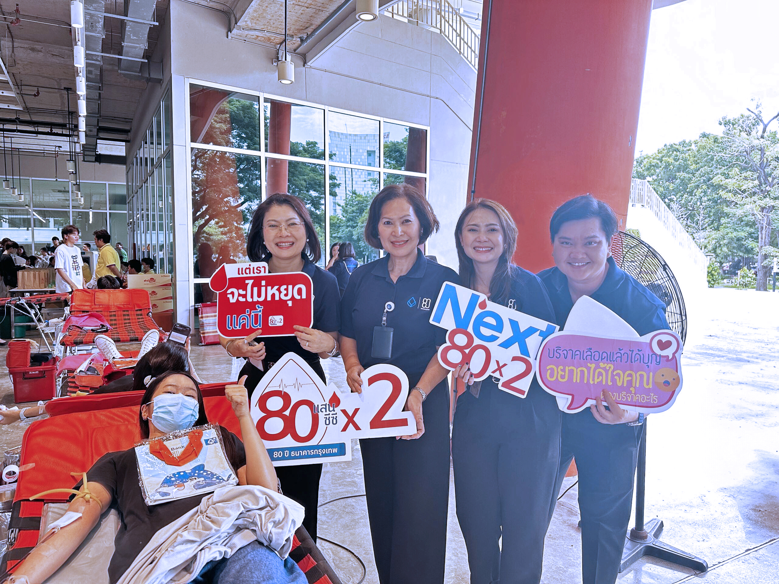 ธนาคารกรุงเทพ จำกัด (มหาชน) นำโดย นางสุไมตรี ประสิทธิ์สารปรีชา ผู้จัดการภาคนครหลวง 2 (ที่ 3 จากซ้าย) นางวาสนา บุญชูช่วย ผู้จัดการสาขาราษฎร์บูรณะ (ที่ 3 จากขวา) นายวสันต์ มูลทองน้อย ผู้จัดการสาขาธนบุรี (ที่ 2 จากซ้าย) และ นางสาวสุกัญญา ยงเจริญกิจกุล ผู้ช่วยผู้จัดการสาขามหาวิทยาลัยเทคโนโลยีพระจอมเกล้าธนบุรี (ขวาสุด) ร่วมกับ มหาวิทยาลัยเทคโนโลยีพระจอมเกล้าธนบุรี ในฐานะองค์กรพันธมิตรชั้นนำของธนาคาร นำโดย รศ.ดร.เชาวลิต ลิ้มมณีวิจิตร รองอธิการบดี ฝ่ายพัฒนานักศึกษาและผู้เรียนรู้ (ที่ 5 จากซ้าย) พร้อมด้วย นางสินีนาฏ อุทา ผู้ช่วยผู้อำนวยการด้านการบริการโลหิต ศูนย์บริการโลหิตแห่งชาติ สภากาชาดไทย (ที่ 4 จากซ้าย) ชวนคณะผู้บริหาร นักศึกษาและประชาชนทั่วไป รวมพลังร่วมบริจาคโลหิต สมทบกิจกรรม “80 แสนซีซี x 2” สานต่อโครงการ “80 แสนซีซี 80 ปี ธนาคารกรุงเทพ” เพิ่มปริมาณโลหิตสำรองคงคลังของศูนย์บริการโลหิตแห่งชาติ สภากาชาดไทย เพื่อนำไปใช้ช่วยชีวิตเพื่อนมนุษย์ยามฉุกเฉินต่อไป โดยเพียงวันเดียวมี “ผู้ให้” เข้าร่วมบริจาคกว่า 149 ราย ในจำนวนนี้เป็นกลุ่มผู้บริจาครุ่นใหม่ที่บริจาคเป็นครั้งแรกถึง 96 ราย ปริมาณโลหิตที่ได้รับบริจาครวม 59,600 ซีซี