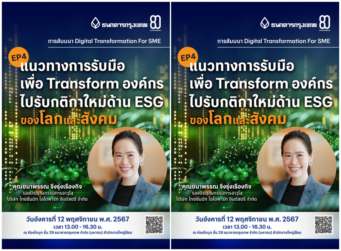 ธนาคารกรุงเทพ จำกัด (มหาชน) ‘ธนาคารชั้นนำระดับภูมิภาค’ ที่พร้อมเป็น ‘เพื่อนคู่คิด’ ผู้ประกอบการ SMEs นำโดย ดร.พิเชฐ ดุรงคเวโรจน์ กรรมการบริหาร จัดสัมมนา “Digital Transformation For SME-EP4” ส่งท้ายปี หัวข้อ : แนวทางการรับมือเพื่อ Transform องค์กร ไปรับกติกาใหม่ด้าน ESG ของโลกและสังคม ในวันอังคาร ที่ 12 พฤศจิกายน 2567 เวลา 13.00 – 16.30 น. ณ ห้องโกมุท ชั้น 29 ธนาคารกรุงเทพ สำนักงานใหญ่ สีลม โดยผู้เข้าร่วมสัมมนาจะได้รับฟังมุมมอง แนวคิด และกลยุทธ์ทางธุรกิจ จากองค์กรธุรกิจผู้ผลิตชิ้นส่วนยานยนต์ชั้นนำในเอเชีย ที่ให้ความสำคัญรวมปัจจัย ESG เข้ากับการดำเนินธุรกิจ จากความท้าทายจึงกลายเป็นโอกาสข้ามพรมแดนขยายตลาดการค้า…อีกหนึ่งเสียงที่จะมายืนยันว่า หากจะไปต่อกับเทรนด์โลกอนาคต ‘กลยุทธ์ ESG’ คือกติกาสากลใหม่ เพื่อสร้างความมั่นคงยั่งยืนทางธุรกิจ ผ่านหัวข้อที่น่าสนใจ ดังนี้