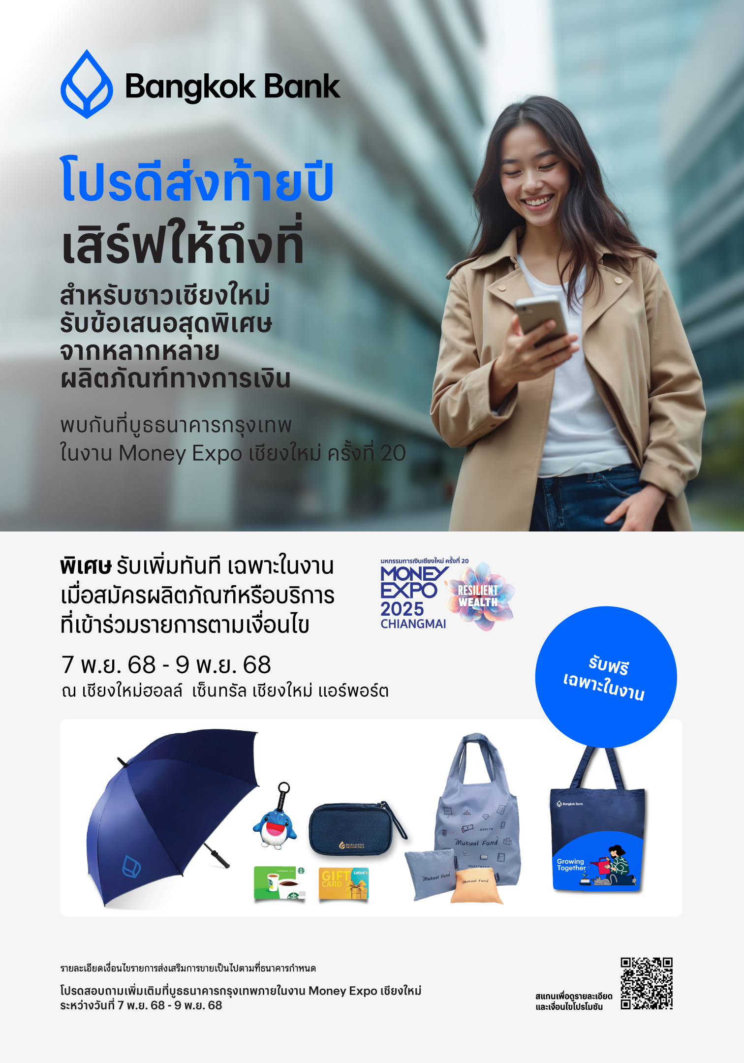ผู้สนใจสามารถขอรับคำปรึกษาด้านการเงิน การลงทุน หรือสมัครบริการต่างๆ ที่มาพร้อมกับโปรโมชันพิเศษ ได้ที่บูธ ธนาคารกรุงเทพ ในงานมหกรรมการเงินเชียงใหม่ ครั้งที่ 20 (Money Expo Chiangmai 2025) ระหว่างวันที่ 7–9 พฤศจิกายน 2568 ณ เชียงใหม่ ฮอลล์ ศูนย์การค้าเซ็นทรัล เชียงใหม่ แอร์พอร์ต