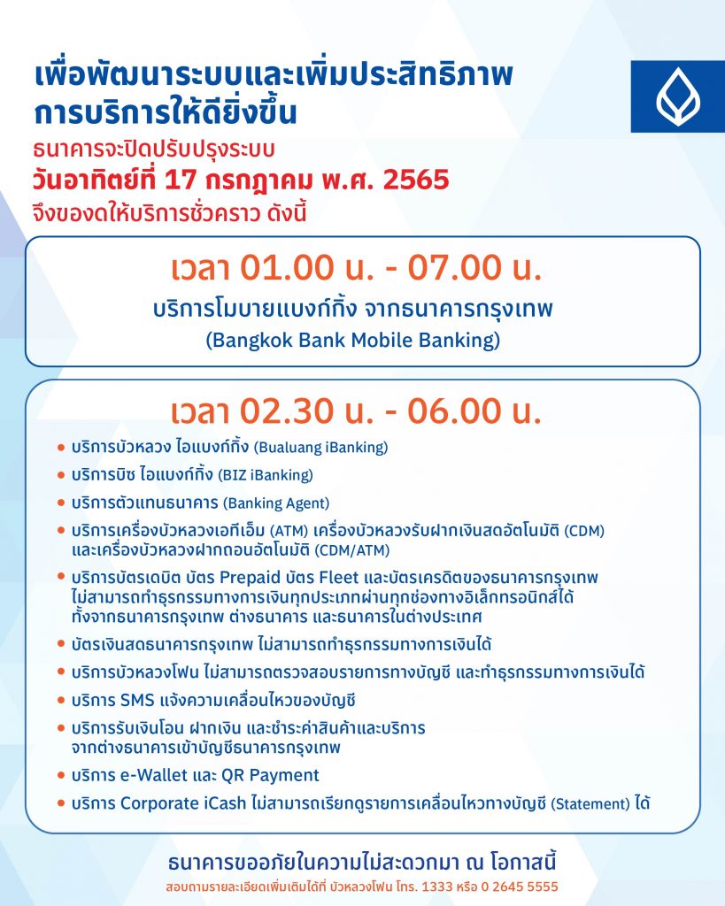 ธนาคารกรุงเทพ จำกัด (มหาชน) แจ้งขออภัยในความไม่สะดวก กรณีขอปิดปรับปรุงระบบงานอิเล็กทรอนิกส์ชั่วคราว เพื่อพัฒนาและเพิ่มประสิทธิภาพการบริการให้ดียิ่งขึ้น ในเช้าวันอาทิตย์ที่ 17 กรกฎาคม พ.ศ. 2565 เวลา 01.00 น. – 07.00 น. ซึ่งจะส่งผลให้ลูกค้าของธนาคารและลูกค้าต่างธนาคาร ไม่สามารถใช้บริการทำธุรกรรมในวันและช่วงเวลาที่กำหนดได้ ตามรายละเอียด ดังนี้