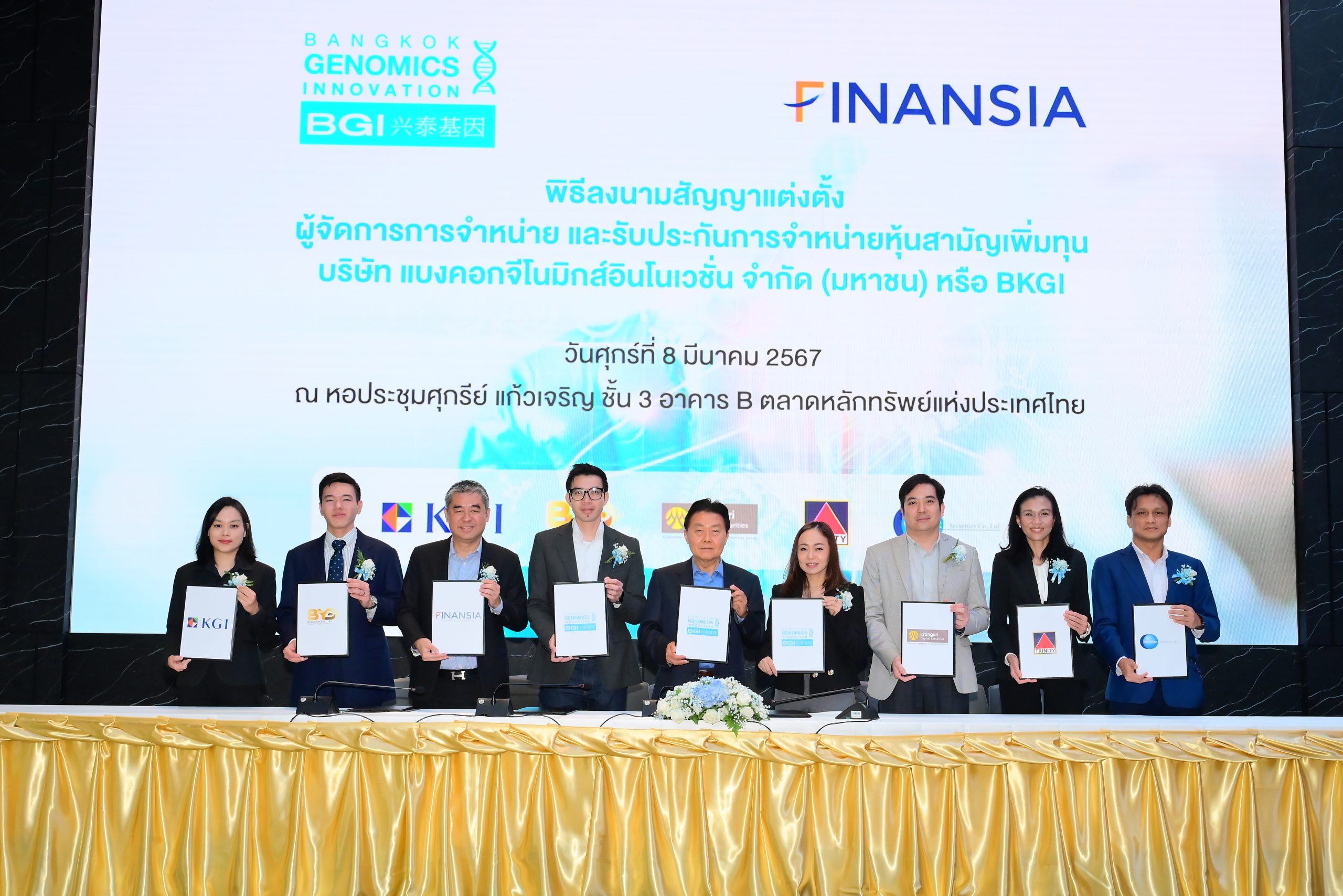 นายกรพจน์ อัศวินวิจิตร (กลาง) ประธานกรรมการบริหาร ดร.เสาวลักษณ์ ด่านสกุล (ที่ 4 จากขวา) ประธานเจ้าหน้าที่บริหาร นายสุจี เชา (ที่ 4 จากซ้าย) กรรมการ บริษัท แบงคอกจีโนมิกส์อินโนเวชั่น จำกัด (มหาชน) (BKGI) ลงนามเซ็นสัญญาแต่งตั้งให้ บริษัทหลักทรัพย์ ฟินันเซีย ไซรัส จำกัด (มหาชน) เป็นผู้จัดการการจัดจำหน่ายและรับประกันการจำหน่ายหุ้นสามัญเพิ่มทุน (Lead Underwriter) โดยมีคุณสมภพ กีระสุนทรพงษ์ (ที่ 3 จากซ้าย) กรรมการผู้อำนวยการ บริษัทหลักทรัพย์ ฟินันเซีย ไซรัส จำกัด (มหาชน) ในฐานะที่ปรึกษาทางการเงิน และผู้จัดการการจัดจำหน่ายและรับประกันการจำหน่ายหุ้นสามัญเพิ่มทุนต่อประชาชนทั่วไปเป็นครั้งแรก (IPO) ร่วมลงนาม พร้อมทั้งแต่งตั้งผู้ร่วมจัดจำหน่ายอีก 5 ราย บริษัทหลักทรัพย์ กรุงศรี พัฒนสิน จำกัด (มหาชน), บริษัทหลักทรัพย์ โกลเบล็ก จำกัด, บริษัทหลักทรัพย์ เคจีไอ (ประเทศไทย) จำกัด (มหาชน), บริษัทหลักทรัพย์ ทรีนีตี้ จำกัด และบริษัทหลักทรัพย์ บียอนด์ จำกัด (มหาชน) โดย BKGI จะเสนอขายหุ้น IPO จำนวนไม่เกิน 160 ล้านหุ้น ในราคาหุ้นละ 1.63 บาท และกำหนดจองซื้อในวันที่ 12-14 มีนาคม 2567 นี้ ซึ่งงานดังกล่าวจัดขึ้น ณ หอประชุมศุกรีย์ แก้วเจริญ ตลาดหลักทรัพย์แห่งประเทศไทย