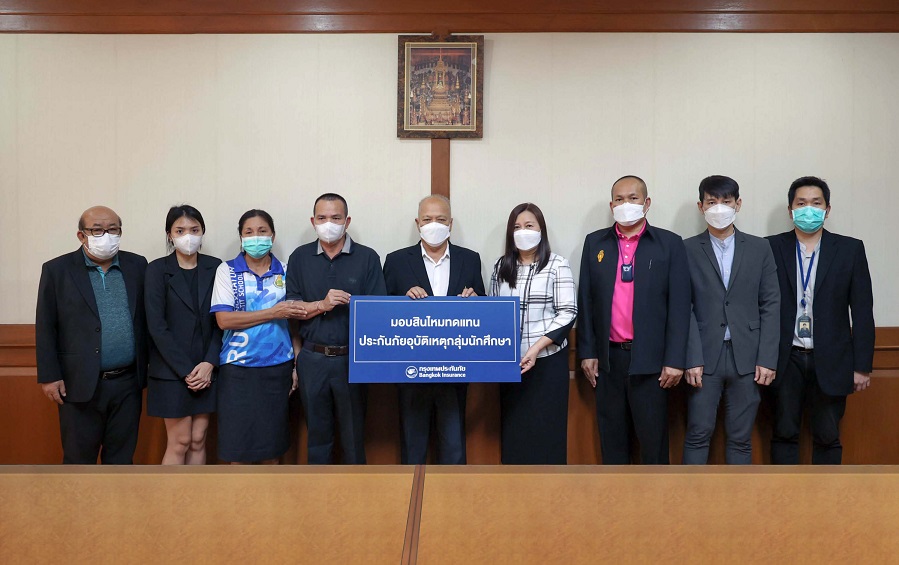 บริษัท กรุงเทพประกันภัย จำกัด (มหาชน) หรือ BKI โดยนางสาวปวีณา จูชวน (ที่ 4 จากขวา) ผู้ช่วยกรรมการผู้อำนวยการใหญ่ เป็นผู้แทนบริษัทฯ มอบสินไหมทดแทนประกันภัยอุบัติเหตุกลุ่มนักศึกษา จำนวน 150,000 บาท (หนึ่งแสนห้าหมื่นบาทถ้วน) ให้แก่นายสมบูรณ์ อีสา (ที่ 4 จากซ้าย) และนางศิรินภา อีสา (ที่ 3 จากซ้าย) ผู้รับประโยชน์ซึ่งเป็นบิดาและมารดาของจ่าโท สหรัฐ อีสา ผู้เอาประกันภัยซึ่งเสียชีวิตจากเหตุการณ์เรือหลวงสุโขทัยอับปาง โดยผู้เอาประกันภัยได้มีประกันภัยอุบัติเหตุกลุ่มจากการเป็นนักศึกษาปริญญาตรีในโครงการศึกษาภาคพิเศษหลักสูตรนิติศาสตรบัณฑิต วิทยาเขตบางนา มหาวิทยาลัยรามคำแหง โดยมีผู้ช่วยศาสตราจารย์ ดร.บุญชาล ทองประยูร (ยืนกลาง) รักษาราชการแทน อธิการบดีมหาวิทยาลัยรามคำแหง พร้อมด้วยผู้บริหารมหาวิทยาลัยร่วมมอบสินไหมทดแทนและเป็นสักขีพยาน ณ สำนักงานอธิการบดี มหาวิทยาลัยรามคำแหง เมื่อวันที่ 24 มกราคม 2566