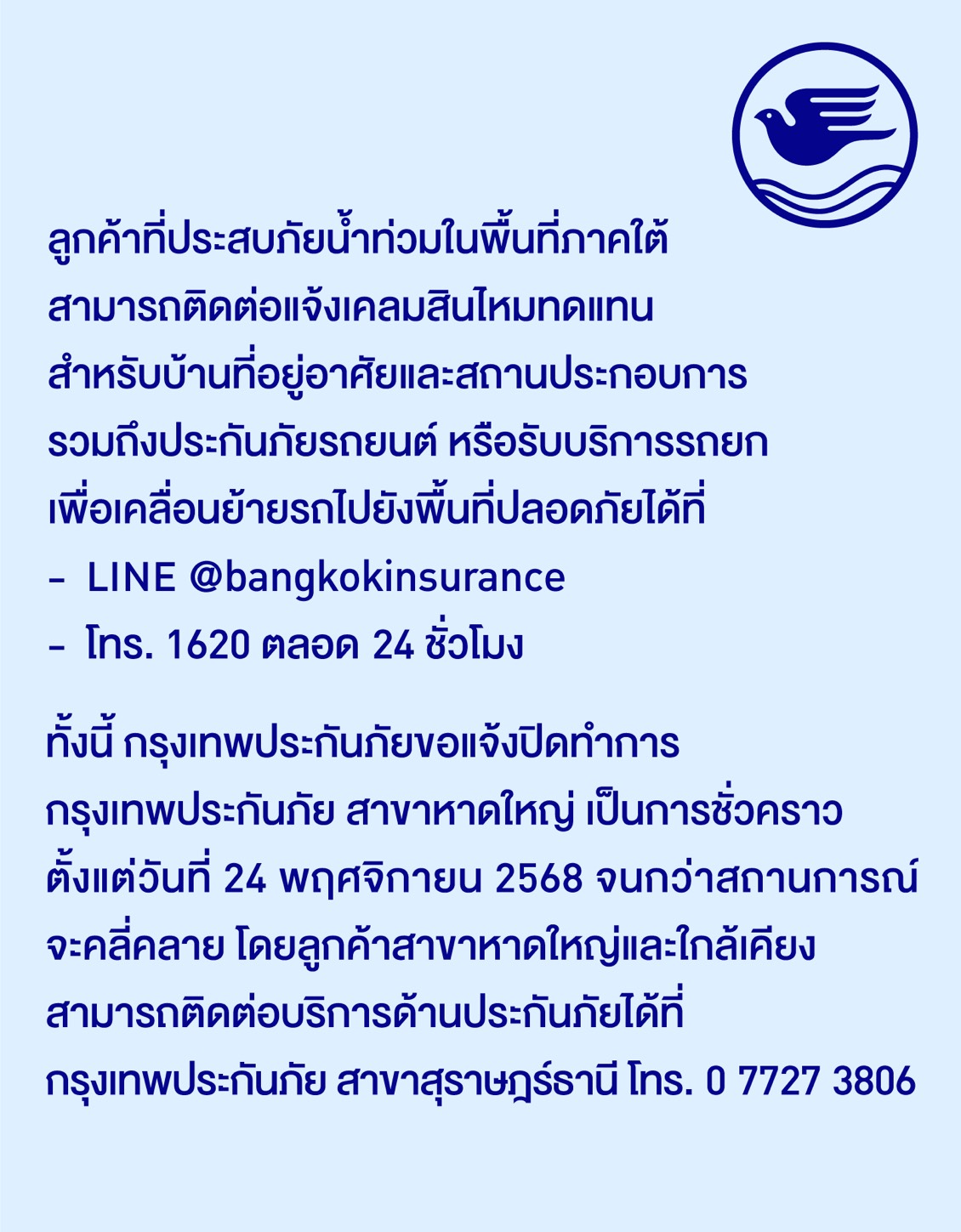 จากสถานการณ์อุทกภัยส่งผลให้เกิดน้ำท่วมฉับพลันในหลายพื้นที่ของภาคใต้ โดยขณะนี้จังหวัดสงขลาประกาศเป็นเขตภัยพิบัติ บริษัท กรุงเทพประกันภัย จำกัด (มหาชน) ได้คำนึงถึงความปลอดภัยของลูกค้าและพนักงาน จึงขอแจ้งปิดทำการกรุงเทพประกันภัย สาขาหาดใหญ่ เป็นการชั่วคราว ตั้งแต่วันที่24 พฤศจิกายน 2568 จนกว่าสถานการณ์จะคลี่คลาย โดยลูกค้าสาขาหาดใหญ่และใกล้เคียงสามารถติดต่อบริการด้านประกันภัยได้ที่ กรุงเทพประกันภัย สาขาสุราษฎร์ธานี โทร. 0 7727 3806