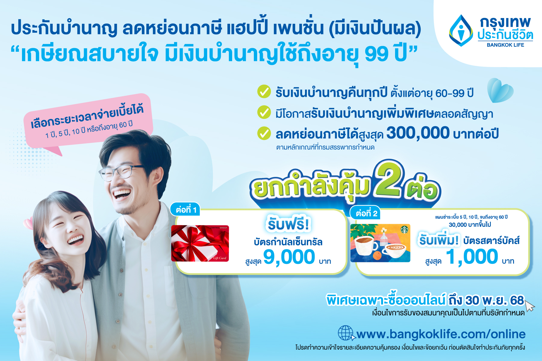 การันตีรับเงินบำนาญ ตั้งแต่อายุ 60-99 ปี มีโอกาสรับเงินบำนาญเพิ่มพิเศษตลอดสัญญา (2) ให้คุณเลือกระยะเวลาชำระเบี้ยได้เอง 1 ปี/ 5 ปี/ 10 ปี หรือจนถึงอายุ 60 ปี วางแผนเกษียณตั้งแต่อายุน้อย ค่าเบี้ยยิ่งถูก