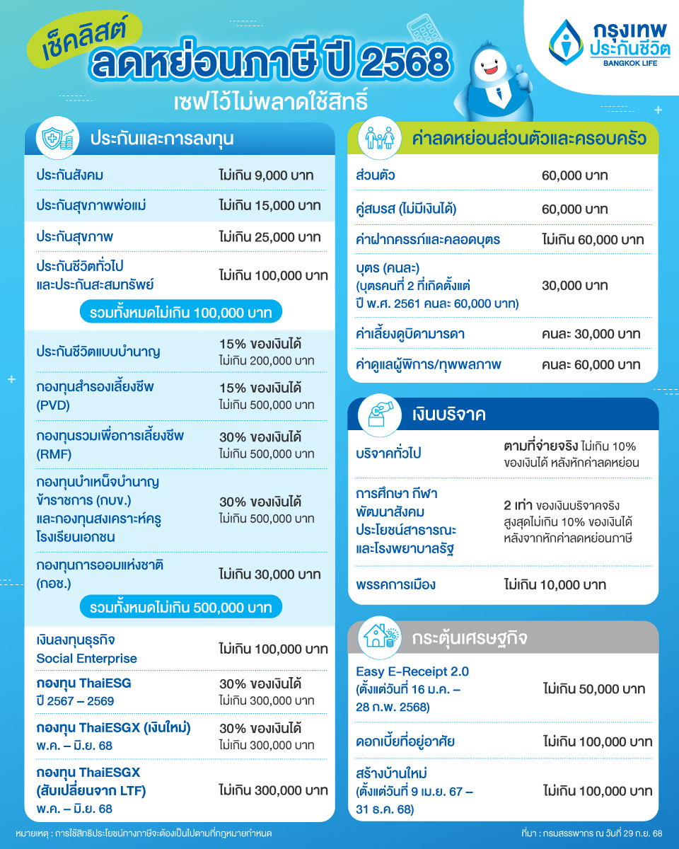 จ่ายภาษียังไงให้ได้กำไร ด้วยเช็คลิสต์ลดหย่อนภาษี ปี 2568 จากกรุงเทพประกันชีวิต tax deduction list 2025 Bangkok Life Assurance