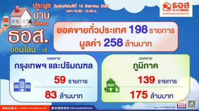 ธอส. เผยผลการประมูลบ้านมือสองออนไลน์ เดือน ส.ค.จำหน่ายได้ 198 รายการ