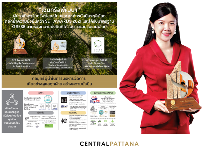 บริษัทฯ มุ่งมั่นใส่ใจดูแลทุกฝ่ายที่เกี่ยวข้องอย่างต่อเนื่อง จนทำให้ได้รับรางวัลด้านความยั่งยืน Highly Commended in Sustainability จาก งาน SET AWARDS 2021 และและติดอันดับหุ้นยั่งยืนต่อเนื่องเป็นปีที่ 7 (นับตั้งแต่ปี 2558 – 2564) อีกทั้งยังได้รับมาตรฐานความยั่งยืนจากการประเมิน GRESB Real Estate Assessment เป็นปีแรกอีกด้วย โดยมาตรฐานการประเมิน GRESB เป็นมาตรวัดความยั่งยืนของธุรกิจในกลุ่มอสังหาริมทรัพย์ที่ได้รับการยอมรับในระดับโลก โดยบริษัทฯ เราได้มาตรฐานระดับ Green Star ถึง 2 หมวดได้แก่ หมวด Management และ Development และยังได้ Score A ในหมวดการเปิดเผยข้อมูลอีกด้วย ซึ่งการได้รับรางวัล และมาตรฐานด้านความยั่งยืนเหล่านี้ สะท้อนถึงการดาเนินงานของบริษัทฯ ที่มุ่งมั่นสร้างความเชื่อมั่นต่อนักลงทุนในด้านเศรษฐกิจและการลงทุนอย่างต่อเนื่อง มีการบริหารจัดการอย่างมีประสิทธิภาพ สื่อสารถึงนักลงทุนอย่างทั่วถึงและโปร่งใส อีกทั้งมีความสามารถในการปรับแผนการดาเนินงานยืดหยุ่นตามสถานการณ์ที่เกิดขี้น โดยให้ความสาคัญกับทุกฝ่ายที่เกี่ยวข้องทั้ง ลูกค้า, ผู้เช่า, ผู้ถือหุ้น, พนักงาน, ไปจนถึงสังคมและชุมชน และพร้อมผนึกกาลังทุกฝ่ายขับเคลื่อนเศรษฐกิจและประเทศไปด้วยกัน
