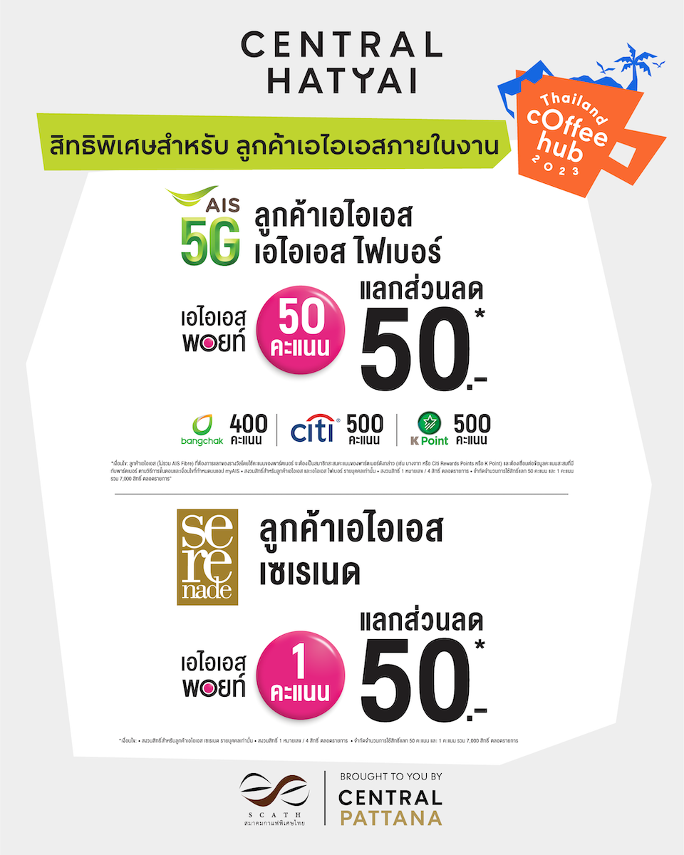 เซ็นทรัลพัฒนา ร่วมกับ สมาคมกาแฟพิเศษไทย จัดงานเทศกาลกาแฟที่ใหญ่ที่สุดแห่งภาคใต้ Thailand Coffee Hub 2023 – Hat Yai Edition จัดเต็มทั้งกาแฟพิเศษแบรนด์ดังจากกทม. ร้านกาแฟ Specialty Coffee Café ทั่วภาคใต้ และจากทั่วประเทศไว้ที่นี่ที่เดียวรวมมากกว่า 100 แบรนด์ พร้อมทั้งกิจกรรม Workshop จากกูรูกาแฟ, ชิมกาแฟระดับเทพฟรีทุกวัน ! ทั้งสายอาราบิก้า และโรบัสต้า และร่วมลุ้นการแข่งขันเพื่อเฟ้นหาบาริสต้าระดับประเทศพร้อมสนับสนุนและส่งเสริมผู้ประกอบการธุรกิจกาแฟ ยกระดับเมล็ดกาฟคุณภาพของไทยให้เป็นที่รู้จัก สร้างรายได้ให้แก่เกษตรกรไทย ภายในงานพบกับ ไฮไลท์พิเศษที่มีเฉพาะงาน นี้เท่านั้น