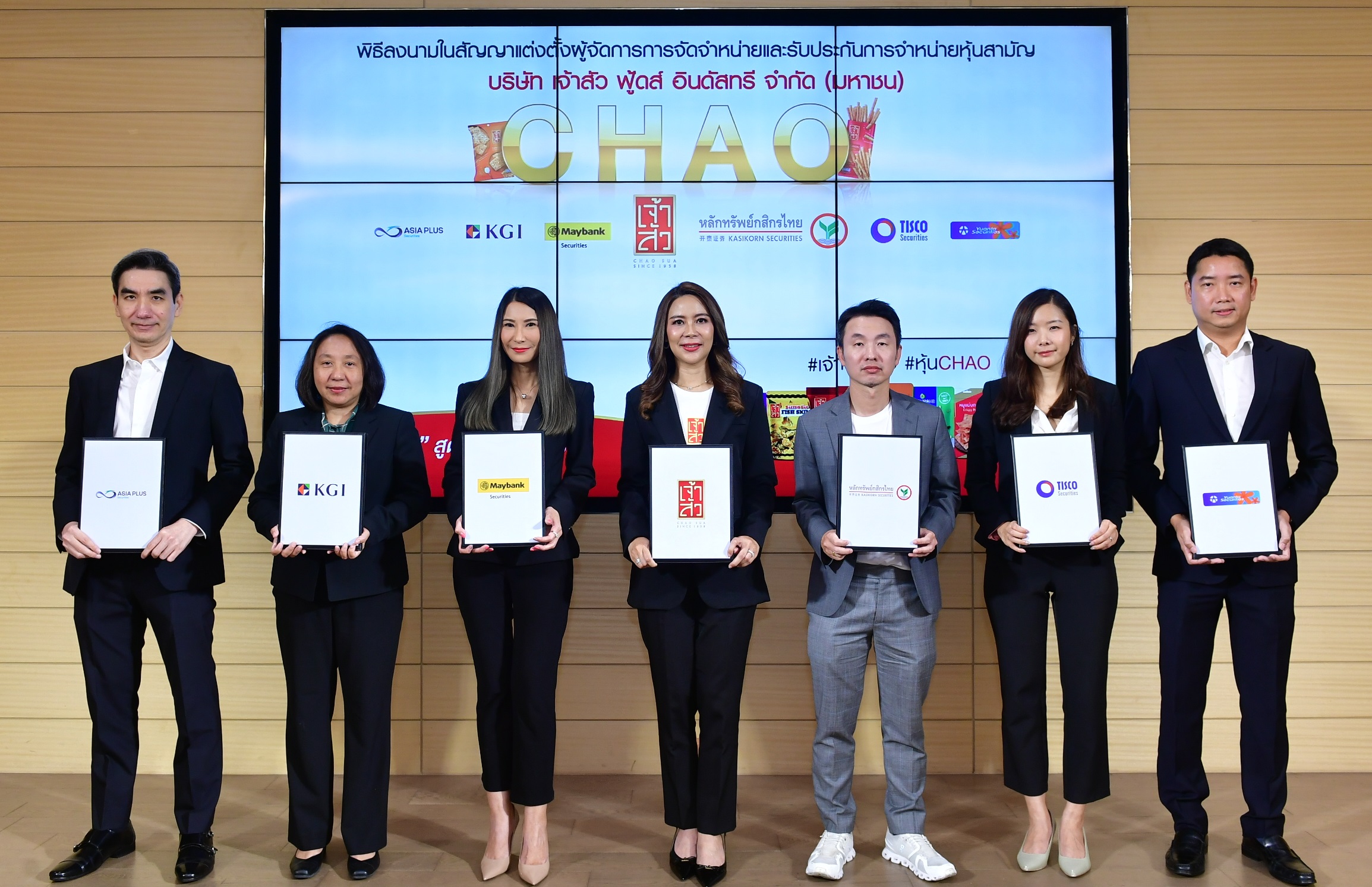 บริษัท เจ้าสัว ฟู้ดส์ อินดัสทรี จำกัด (มหาชน) หรือ CHAO ลงนามแต่งตั้ง บริษัทหลักทรัพย์ กสิกรไทย จำกัด (มหาชน) เป็นผู้จัดการการจัดจำหน่ายและรับประกันการจำหน่ายหุ้นสามัญ พร้อมแต่งตั้งผู้จัดจำหน่ายและรับประกันการจำหน่ายหุ้นสามัญอีก 5 ราย ประกอบด้วย (1) บริษัทหลักทรัพย์ เอเซีย พลัส จำกัด (2) บริษัทหลักทรัพย์ เคจีไอ (ประเทศไทย) จำกัด (มหาชน) (3) บริษัทหลักทรัพย์ เมย์แบงก์ (ประเทศไทย) จำกัด (มหาชน) (4) บริษัทหลักทรัพย์ ทิสโก้ จำกัด และ (5) บริษัทหลักทรัพย์ หยวนต้า (ประเทศไทย) จำกัด
