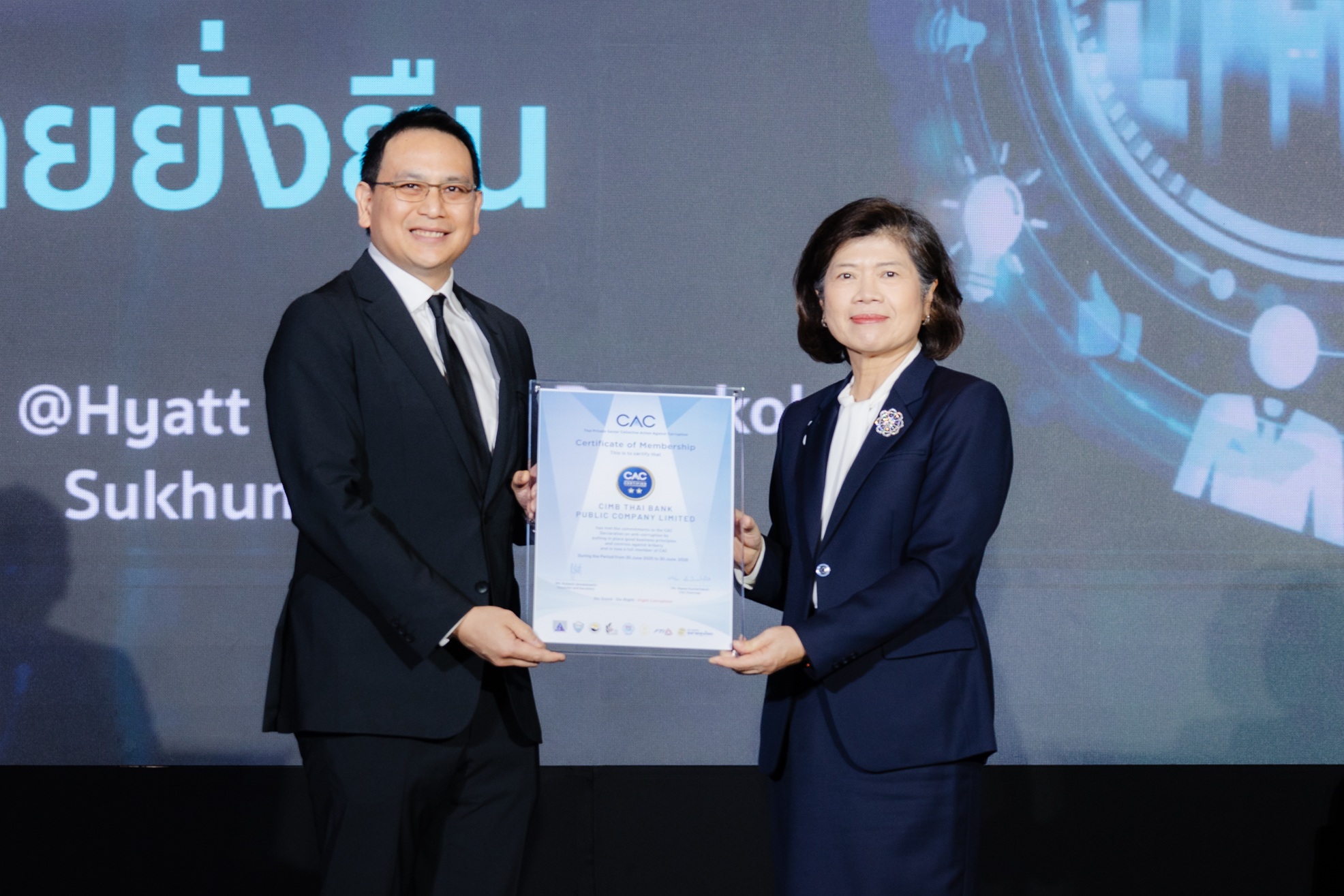 นายวุธว์ ธนิตติราภรณ์ กรรมการผู้จัดการใหญ่ และประธานเจ้าหน้าที่บริหาร ธนาคาร ซีไอเอ็มบี ไทย ได้รับมอบประกาศนียบัตรรับรองการเป็นสมาชิกแนวร่วมต่อต้านคอร์รัปชันของภาคเอกชนไทย ซึ่งธนาคาร ซีไอเอ็มบี ไทย ได้รับรองการเป็นสมาชิกฯ ต่อเนื่อง เป็นครั้งที่ 2 (CAC Recertification) จากแนวร่วมต่อต้านคอร์รัปชันของภาคเอกชนไทย (Thai Private Sector Collective Action Against Corruption (CAC)) ในงาน CAC Certification Ceremony 2/2025 เมื่อวันที่ 24 พฤศจิกายน 2568 ณ โรงแรมไฮแอท รีเจนซี่ กรุงเทพฯ