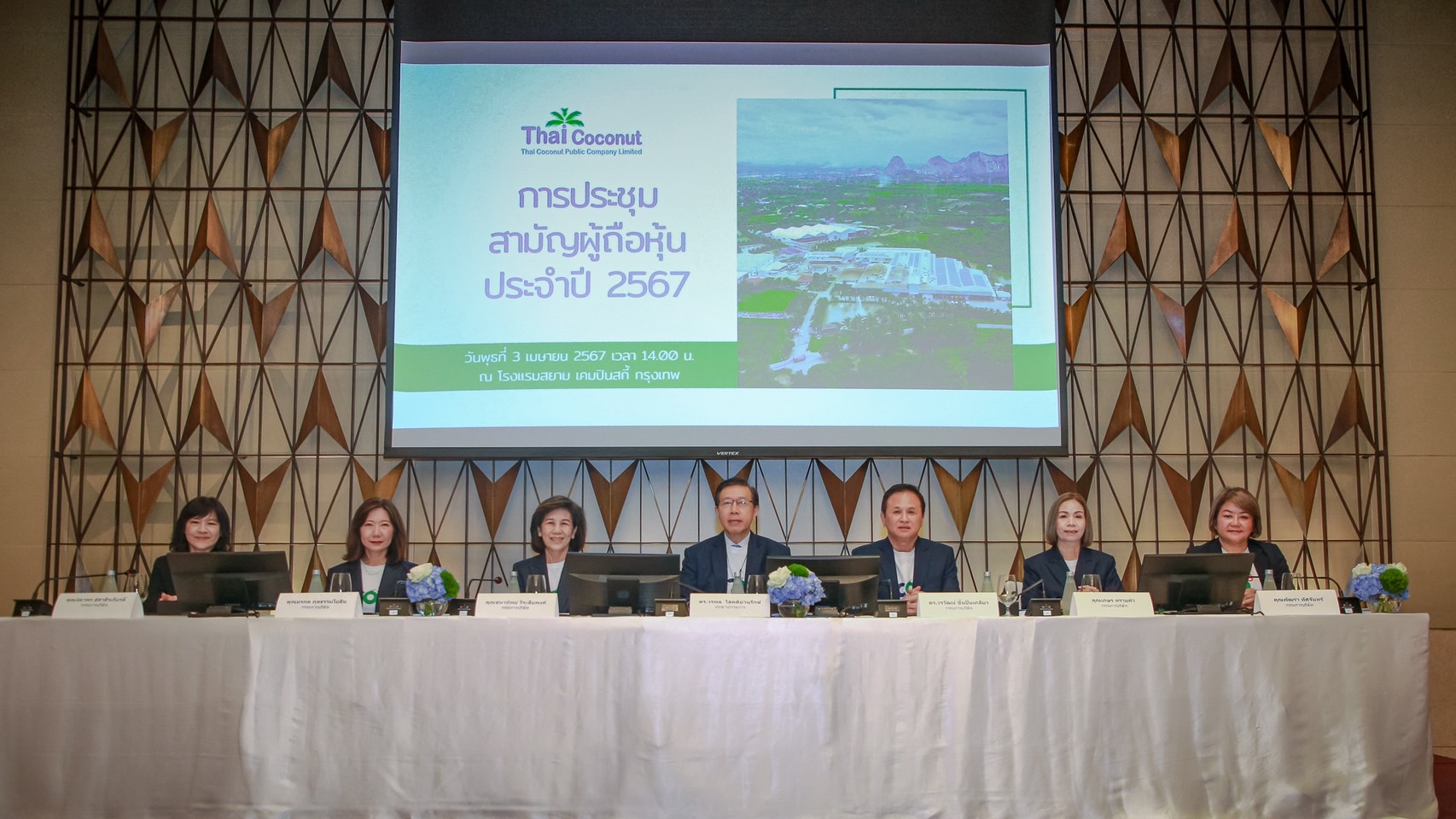 ดร.วรพล โสคติยานุรักษ์ (กลาง) ประธานกรรมการบริษัท, ดร.วรวัฒน์ ชิ้นปิ่นเกลียว (ที่ 3 จากขวา) ประธานเจ้าหน้าที่บริหาร, คุณเกษร ทรายคำ (ที่ 2 จากขวา) ประธานเจ้าหน้าที่ฝ่ายปฏิบัติการ, คุณพัฒรา ทัศจันทร์ (ที่ 1 จากขวา) ประธานเจ้าหน้าที่ฝ่ายการเงินและสารสนเทศ บริษัท ไทย โคโคนัท จำกัด (มหาชน) หรือ “COCOCO” ถ่ายภาพร่วมกันกับคณะกรรมการบริษัท ภายหลังเสร็จงานประชุมสามัญผู้ถือหุ้นประจำปี 2567 โดยที่ประชุมผู้ถือหุ้น มีมติอนุมัติทุกวาระการประชุม รวมถึงวาระสำคัญ เรื่องการพิจารณาการจ่ายปันผล 0.25 บาทต่อหุ้น โดยวันที่ไม่ได้รับสิทธิปันผล(XD) ในวันที่ 11 เมษายน 2567 และวันกำหนดรายชื่อผู้ถือหุ้นที่มีสิทธิได้รับเงินปันผล (Record Date) ในวันที่ 17 เมษายน 2567 พร้อมกับกำหนดจ่ายปันผล ในวันที่ 2 พฤษภาคม 2567