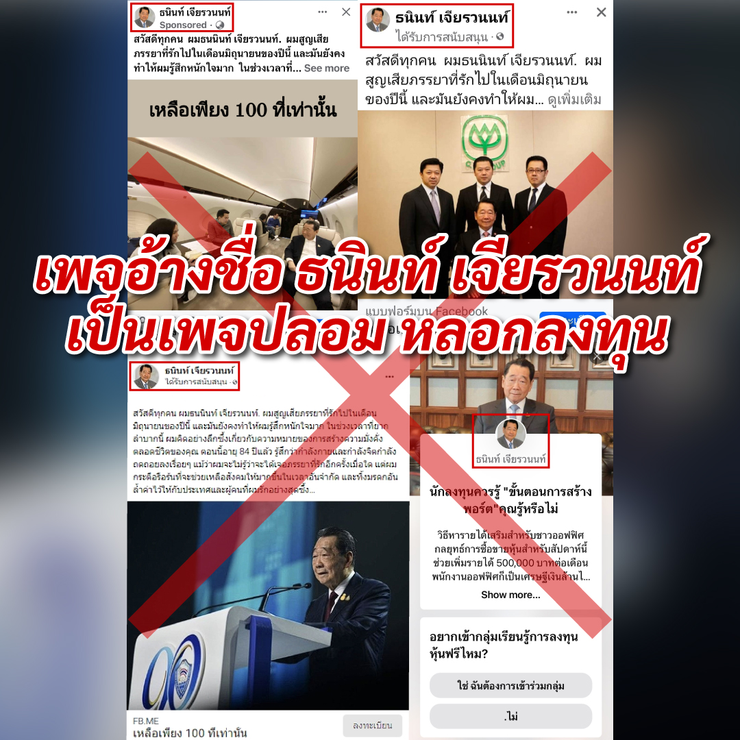 ในการนี้ เครือเจริญโภคภัณฑ์ ขอแจ้งให้ทราบโดยทั่วกันว่า อย่าหลงเชื่อเพจ Facebook ปลอมที่แอบอ้างชื่อเป็นนายธนินท์ เจียรวนนท์ ชักชวนให้ลงทุน ทั้งนี้ นายธนินท์ไม่มีส่วนเกี่ยวข้อง และไม่มีส่วนร่วมทั้งทางตรงและทางอ้อมในการหลอกลงทุนดังกล่าว หากพบการแอบอ้างชื่อไปใช้เพื่อการลงทุน ให้สันนิษฐานได้ว่าเป็นเพจปลอม จึงขอเตือนประชาชนโปรดอย่าหลงเชื่อมิจฉาชีพดังกล่าว เพราะอาจทำให้สูญเสียทรัพย์สินได้ พร้อมขอความร่วมมือไม่ส่งต่อหรือแชร์ข้อมูลดังกล่าวในช่องทางต่าง ๆ ทั้งนี้ บริษัทฯ จะดำเนินการทางกฎหมายอย่างถึงที่สุดกับมิจฉาชีพดังกล่าว