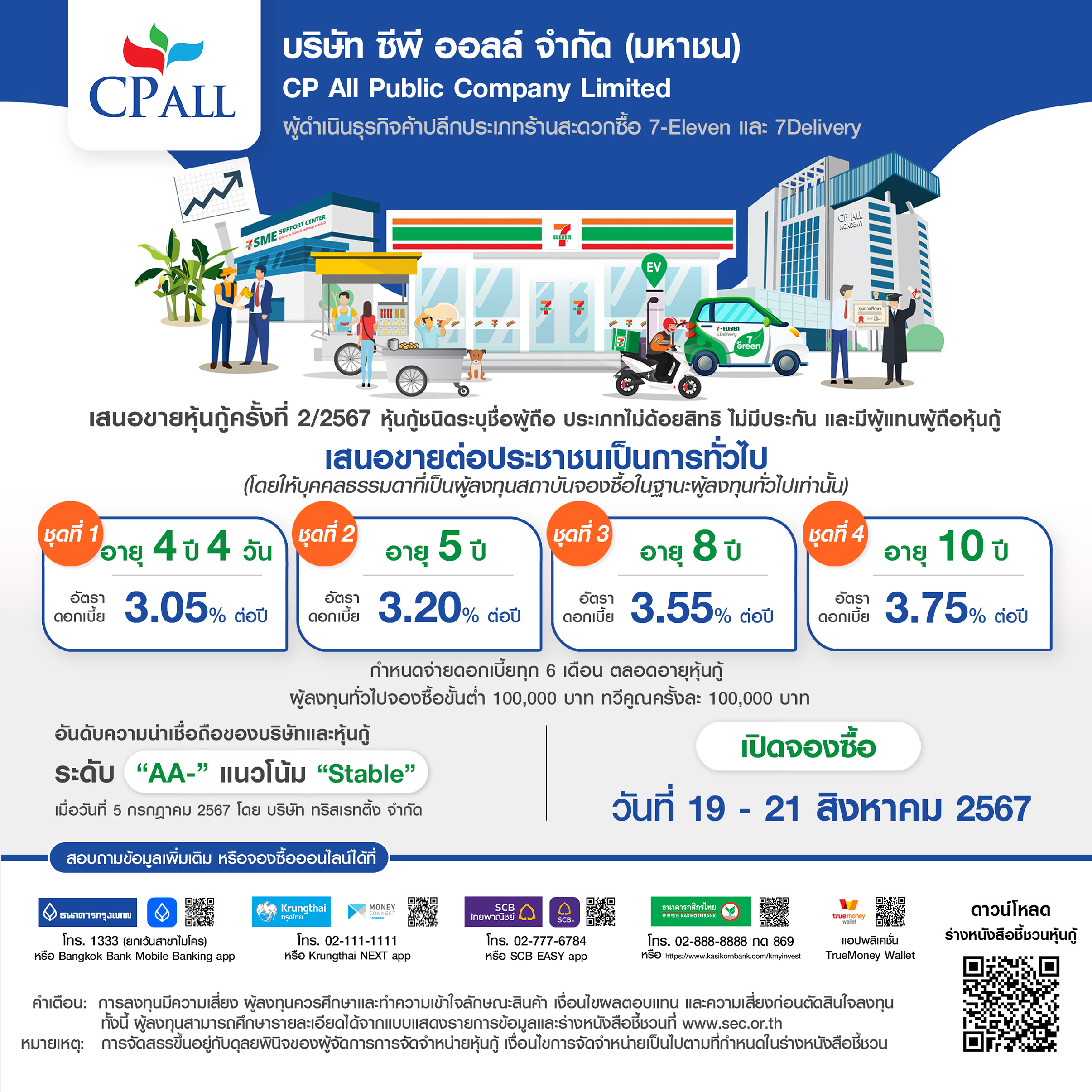 ซีพี ออลล์” ผู้บริหารร้านเซเว่น อีเลฟเว่น เซเว่น เดลิเวอรี่ และผู้ถือหุ้นใหญ่ บริษัท ซีพี แอ็กซ์ตร้า จำกัด (มหาชน) เตรียมออกหุ้นกู้เสนอขายแก่ประชาชนเป็นการทั่วไป จำนวน 4 ชุด อายุหุ้นกู้ตั้งแต่ 4 ปี 4 วัน ถึง 10 ปี อัตราดอกเบี้ยคงที่ระหว่าง 3.05–3.75% ต่อปี โดยหุ้นกู้ที่เสนอขายครั้งนี้ได้รับการปรับเพิ่มอันดับความน่าเชื่อถืออยู่ที่ระดับ “AA-” แนวโน้ม “คงที่” (Stable) จากทริสเรทติ้ง สะท้อนถึงสถานะทางการเงินที่แข็งแกร่งขึ้นของบริษัท ทั้งจากระดับกำไรที่ปรับตัวดีขึ้นและอัตราส่วนหนี้สินทางการเงินที่ลดลง เตรียมเปิดให้จองซื้อระหว่างวันที่ 19 – 21 สิงหาคม 2567 ผ่านสถาบันการเงินชั้นนำ 4 แห่ง รวมถึงขายผ่านแอปพลิเคชั่น TrueMoney Wallet พร้อมเตือนนักลงทุนให้ระมัดระวังมิจฉาชีพหลอกลงทุน