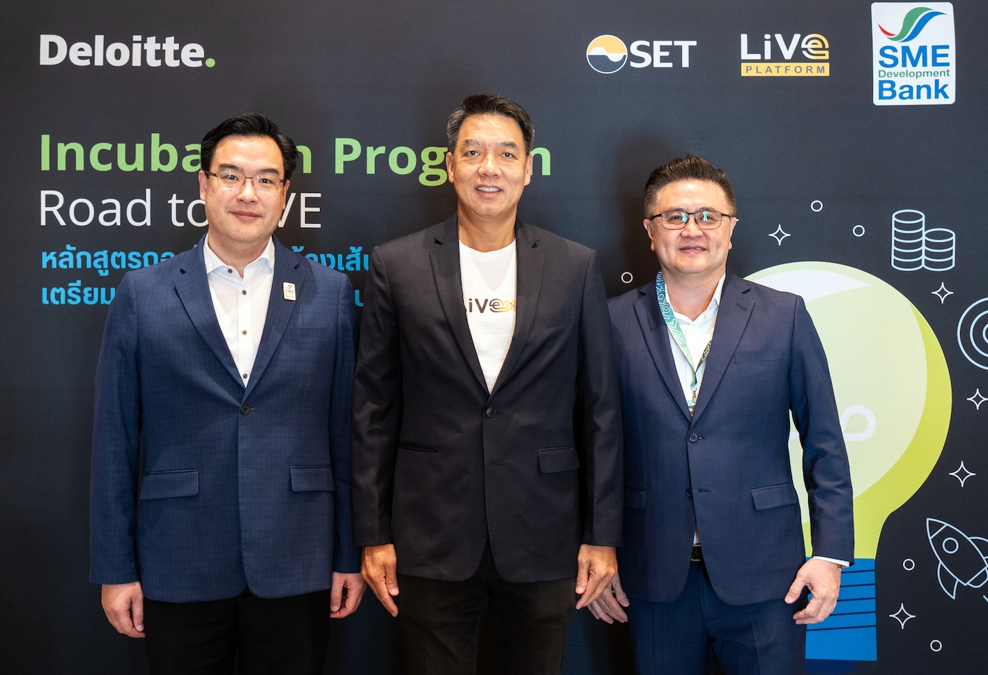 ดีลอยท์ ประเทศไทย ผนึก SME D BANK และตลาดหลักทรัพย์แห่งประเทศไทย ผ่านบริการจาก LiVE Platform จัดโครงการ ‘Incubation Program – Road to LiVE’ หลักสูตรเสริมแกร่งสำหรับ SMEs และ Startups เพื่อเตรียมความพร้อมก้าวสู่ตลาดทุนและสร้างโอกาสในการเติบโต พร้อมโอกาสรับเงินทุนสนับสนุนการดำเนินโครงการฯ จากกองทุนส่งเสริมการพัฒนาตลาดทุน (CMDF) สูงสุด 50,000 บาท